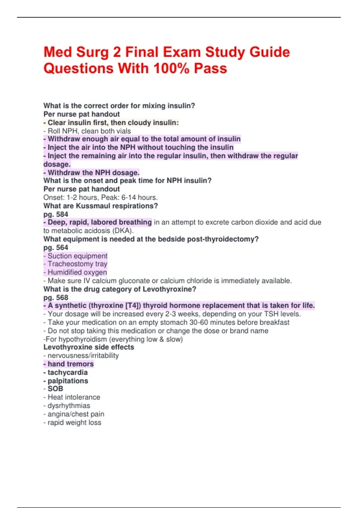 Med Surg 2 Final Exam Study Guide Questions With 100% Pass What is the correct order for mixing insulin? Per nurse pat handout - Clear insulin first, then cloudy insulin: - Roll NPH, clean both vials - Withdraw enough air equal to the total amount of insulin - Inject the air into the NPH without touching the insulin - Inject the remaining air into the regular insulin, then withdraw the regular dosage. - Withdraw the NPH dosage. What is the onset and peak time for NPH insulin? Per nurse pat handout Onset: 1-2 hours, Peak: 6-14 hours. What are Kussmaul respirations? pg. 584 - Deep, rapid, labored breathing in an attempt to excrete carbon dioxide and acid due to metabolic acidosis (DKA). What equipment is needed at the bedside post-thyroidectomy? pg. 564 - Suction equipment - Tracheostomy tray - Humidified oxygen - Make sure IV calcium gluconate or calcium chloride is immediately available. What is the drug category of Levothyroxine? pg. 568 - A synthetic (thyroxine [T4]) thyroid hormone replacement that is taken for life. - Your dosage will be increased every 2-3 weeks, depending on your TSH levels. - Take your medication on an empty stomach 30-60 minutes before breakfast - Do not stop taking this medication or change the dose or brand name -For hypothyroidism (everything low & slow) Levothyroxine side effects - nervousness/irritability - hand tremors - tachycardia - palpitations - SOB - Heat intolerance - dysrhythmias - angina/chest pain - rapid weight loss - sweating - hyperthyroidism What lab value indicates hepatic encephalopathy? pg. 368 Elevated ammonia levels. Elevated potassium, LFT (Treatment: Lactulose) What is the plan of care for acute gastritis? pg. 327 - NO IBUPROFEN - Rest the bowels - NPO initially, then progress to clear liquids, then bland diet as tolerated - IV fluids and medications to reduce stomach acid. - PPIs (omeprazole) or H2 blockers (famotidine) are prescribed to protect the stomach lining. - Sucralfate → coats and protects the gastric mucosa. - Monitor for GI bleeding, anemia - Avoid: caffeine, spicy foods, alcohol, tobacco, NSAIDs - Report dark/tarry stools, coffee-ground emesis, or severe abdominal pain (signs of bleeding) Effects of NSAIDs on gastric ulcer pg. 321, 325 - Should avoid (causes erosive gastritis, direct irritation to the GI [stomach lining], and more GI bleeding) What should be monitored in a client with a nasogastric tube (NGT)? pg. 336 - Document the NG drainage with the client's output - Monitor bowel sounds - Ensure the client is in semi-Fowler's position - Monitor NG tube for placement via X-ray or pH gastric test - Irrigate q4hr - Monitor v/s, daily weight, and nasal area for skin breakdown - Provide oral hygiene q2hr - Maintain intermittent suction PRN What are the signs and symptoms of bowel perforation post-paracentesis? pg. 306 - Fever - Sudden severe abdominal pain - Rigid board-like abdomen/distention, rebound tenderness - Hypovolemia, Hypotension, absent bowel sounds - Change in mental status - Bleeding or leakage of fluid What are the expected findings with pancreatitis? (place in side-lying position) pg. 355