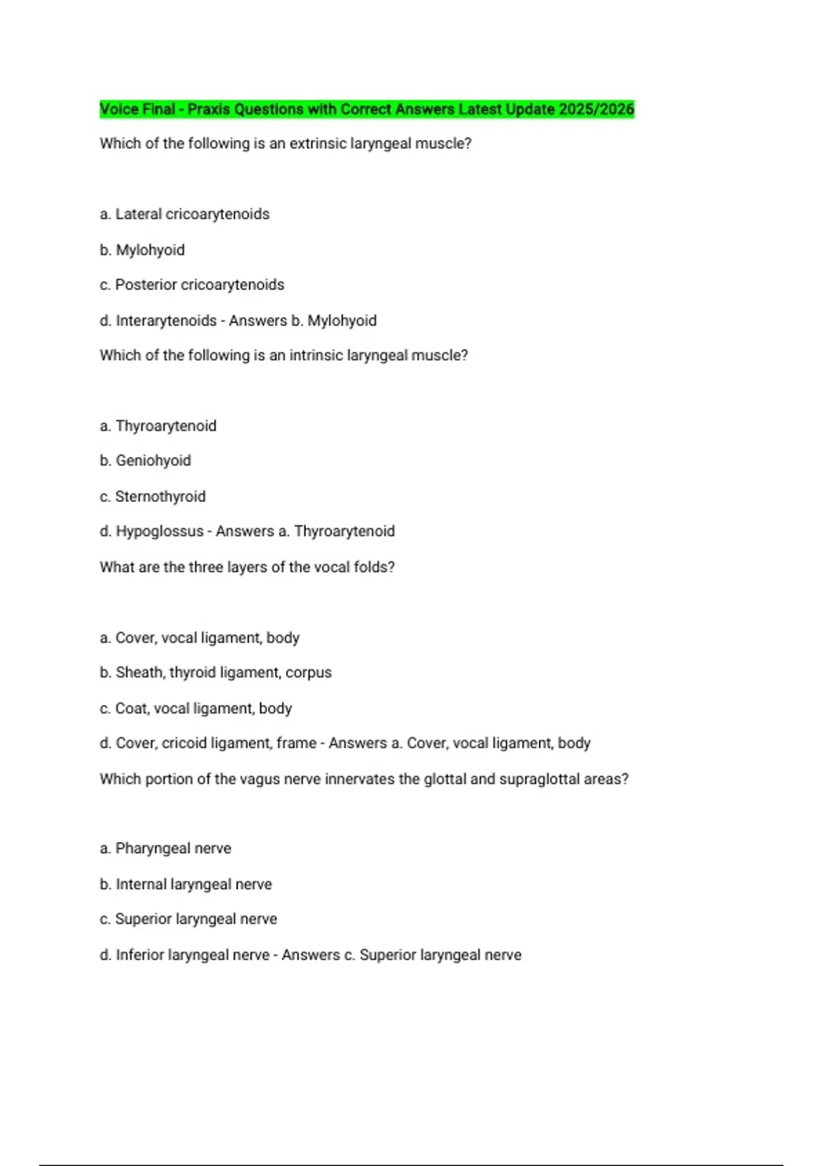 Voice Final - Praxis Questions with Correct Answers Latest Update 2025/2026 Which of the following is an extrinsic laryngeal muscle? a. Lateral cricoarytenoids b. Mylohyoid c. Posterior cricoarytenoids d. Interarytenoids - Answers b. Mylohyoid Which of the following is an intrinsic laryngeal muscle? a. Thyroarytenoid b. Geniohyoid c. Sternothyroid d. Hypoglossus - Answers a. Thyroarytenoid What are the three layers of the vocal folds? a. Cover, vocal ligament, body b. Sheath, thyroid ligament, corpus c. Coat, vocal ligament, body d. Cover, cricoid ligament, frame - Answers a. Cover, vocal ligament, body Which portion of the vagus nerve innervates the glottal and supraglottal areas? a. Pharyngeal nerve b. Internal laryngeal nerve c. Superior laryngeal nerve d. Inferior laryngeal nerve - Answers c. Superior laryngeal nerve Which portion of the vagus nerve innervates the glottal and infraglottal areas? a. External laryngeal nerve b. Recurrent laryngeal nerve c. Pharyngeal nerve d. Superior laryngeal nerve - Answers b. Recurrent laryngeal nerve Which phonation type is best described as noise plus an air burst? a. Normal voice b. Strained voice c. Breathy voice d. Glottal fry - Answers c. Breathy voice What is modal register? a. The lowest portion of one's phonational range b. The largest portion of one's phonational range c. The highest portion of one's phonational range d. The smallest portion of one's phonational range - Answers b. The largest portion of one's phonational range What term refers to the number of times per second the vocal folds open and close during phonation? a. Intensity b. Fundamental frequency c. Jitter d. Shimmer - Answers b. Fundamental frequency