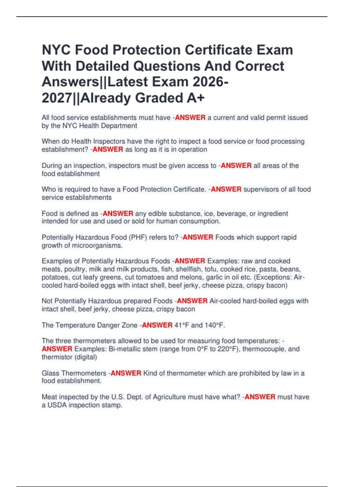 NYC Food Protection Certificate Exam With Detailed Questions And Correct Answers||Latest Exam 2026 2027||Already Graded A+