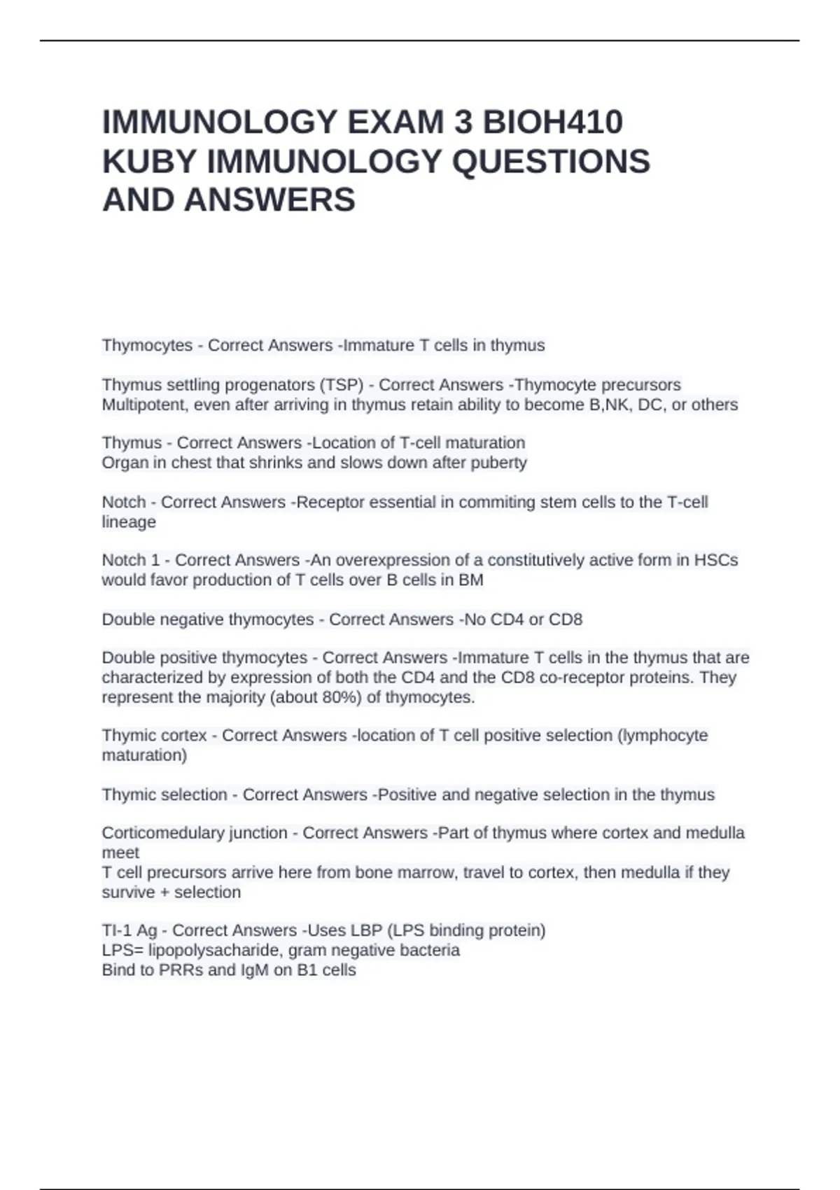 IMMUNOLOGY EXAM 3 BIOH410 KUBY IMMUNOLOGY QUESTIONS AND ANSWERS