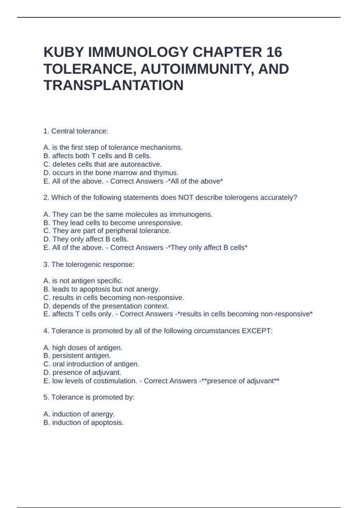 E. affects T cells only. - Correct Answers -*results in cells becoming non-responsive*