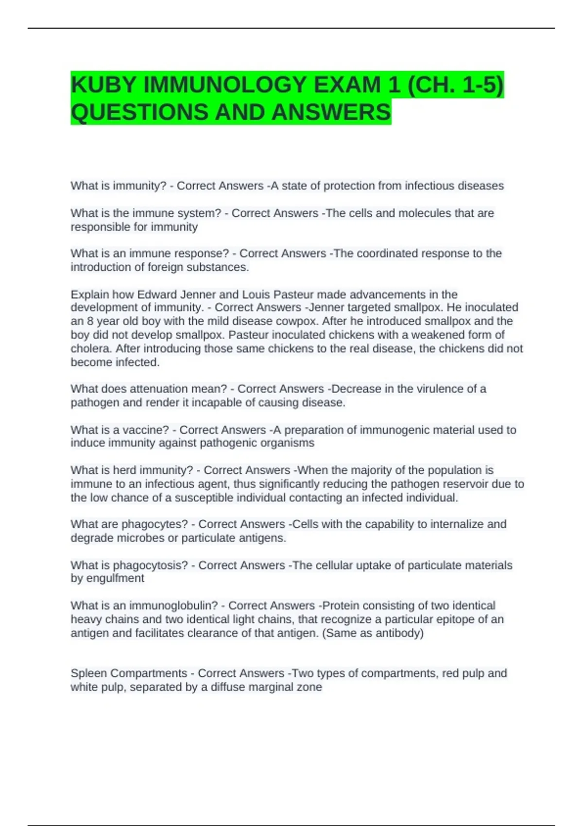KUBY IMMUNOLOGY EXAM 1 (CH. 1-5) QUESTIONS AND ANSWERS