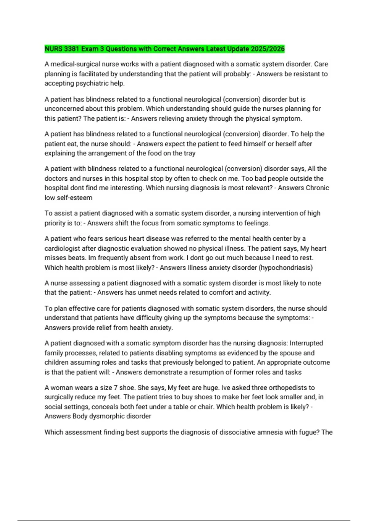 NURS 3381 Exam 3 Questions with Correct Answers Latest Update 2025/2026 A medical-surgical nurse works with a patient diagnosed with a somatic system disorder. Care planning is facilitated by understanding that the patient will probably: - Answers be resistant to accepting psychiatric help. A patient has blindness related to a functional neurological (conversion) disorder but is unconcerned about this problem. Which understanding should guide the nurses planning for this patient? The patient is: - Answers relieving anxiety through the physical symptom. A patient has blindness related to a functional neurological (conversion) disorder. To help the patient eat, the nurse should: - Answers expect the patient to feed himself or herself after explaining the arrangement of the food on the tray A patient with blindness related to a functional neurological (conversion) disorder says, All the doctors and nurses in this hospital stop by often to check on me. Too bad people outside the hospital dont find me interesting. Which nursing diagnosis is most relevant? - Answers Chronic low self-esteem To assist a patient diagnosed with a somatic system disorder, a nursing intervention of high priority is to: - Answers shift the focus from somatic symptoms to feelings. A patient who fears serious heart disease was referred to the mental health center by a cardiologist after diagnostic evaluation showed no physical illness. The patient says, My heart misses beats. Im frequently absent from work. I dont go out much because I need to rest. Which health problem is most likely? - Answers Illness anxiety disorder (hypochondriasis) A nurse assessing a patient diagnosed with a somatic system disorder is most likely to note that the patient: - Answers has unmet needs related to comfort and activity. To plan effective care for patients diagnosed with somatic system disorders, the nurse should understand that patients have difficulty giving up the symptoms because the symptoms: - Answers provide relief from health anxiety. A patient diagnosed with a somatic symptom disorder has the nursing diagnosis: Interrupted family processes, related to patients disabling symptoms as evidenced by the spouse and children assuming roles and tasks that previously belonged to patient. An appropriate outcome is that the patient will: - Answers demonstrate a resumption of former roles and tasks A woman wears a size 7 shoe. She says, My feet are huge. Ive asked three orthopedists to surgically reduce my feet. The patient tries to buy shoes to make her feet look smaller and, in social settings, conceals both feet under a table or chair. Which health problem is likely? - Answers Body dysmorphic disorder Which assessment finding best supports the diagnosis of dissociative amnesia with fugue? The patient states: - Answers I cannot recall why Im living in this town A college student observes a roommate going out wearing uncharacteristically seductive clothing, returning 12 to 24 hours later, and then sleeping for 8 to 12 hours. At other times, the roommate sits on the floor speaking like a young child. Which health problem should be considered? - Answers Dissociative identity disorder A nurse assesses a patient diagnosed with functional neurological (conversion) disorder. Which comment is most likely from this patient? - Answers Since my father died, Ive been short of breath and had sharp pains that go down my left arm, but I think its justindigestion. A nurse counsels a patient diagnosed with body dysmorphic disorder. Which nursing diagnosis would be a priority for the plan of care? - Answers Risk for suicide Select the correct etiology to complete this nursing diagnosis for a patient diagnosed with dissociative identity disorder: Disturbed personal identity, related to: - Answers cognitive distortions associated with unresolved childhood abuse issues For a patient diagnosed with dissociative amnesia, complete this outcome: Within 4 weeks, the patient will demonstrate an ability to execute complex mental processes by: - Answers describing previously forgotten experiences 15. A person comes to the clinic reporting, I wear a scarf across my lower face when I go out but because of my ugly appearance. Assessment reveals an average appearance with no actual disfigurement. Which problem is most likely? - Answers Body dysmorphic disorder A nurse counseling a patient diagnosed with dissociative identity disorder (DID) should understand that the assessment of highest priority is: - Answers risk for self-harm A patient says, I feel detached and weird all the time, like Im looking at life through a cloudy window. - Answers Depersonalization A patient reports fears of having cervical cancer and says to the nurse, Ive had Pap smears by six different doctors. The results are normal, but Im sure thats because of errors in the laboratory. Which disorder would the nurse suspect? - Answers Illness anxiety disorder (hypochondriasis) A patient diagnosed with somatic symptom disorder says, I have pain from an undiagnosed injury. I cant take care of myself. I need pain medicine six or seven times a day. I feel like a baby because my family has to help me so much. It is important for the nurse to assess: - Answers secondary gains The causes of somatic system disorders may be related to: - Answers faulty perceptions of body sensations. What is the primary difference between somatic system disorders and dissociative disorders? - Answers Dissociative disorders entail stress-related disruptions of memory, consciousness, or identity, whereas somatic system disorders involve the expression of psychological stress through somatic symptoms. A patient says, I know I have a brain tumor despite the results of the magnetic resonance image (MRI). The radiologist is wrong. People who have brain tumors vomit, and yesterday I vomited all day. Which response by the nurse fosters cognitive restructuring? - Answers Lets see whether any other explanations for your vomiting are possi