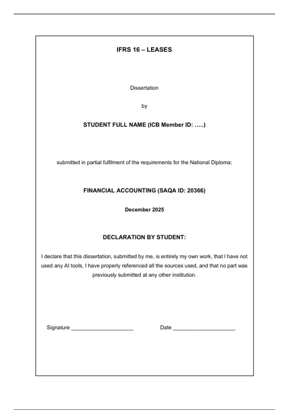 A dissertation, or in this case, a mini-dissertation, is an academic document that records research conducted in a particular field of study. Financial Accounting topic - IFRS 16 - Leases. The introduction of IFRS 16 in replacement of IAS 17, respectively, and the related minor amendments over the years should provide you with sufficient international critique (with respect to your chosen topic) to include in your dissertation. IFRS 16 as your topic, you could also look at how better or worse the reporting of leases is under IFRS 16, relative to how it was under IAS 17 and the steps taken, thus far, to address IFRS 16's shortcomings, if any. The dissertation should clearly indicate proper research on the following: − A brief overview of the Standard − Positive international critique with respect to the Standard (perceived strengths) − Negative international critique with respect to the Standard (perceived weaknesses) − Practical evidence supporting your findings (may be cited) − A summary of international recommendations as to how the standard can be improved