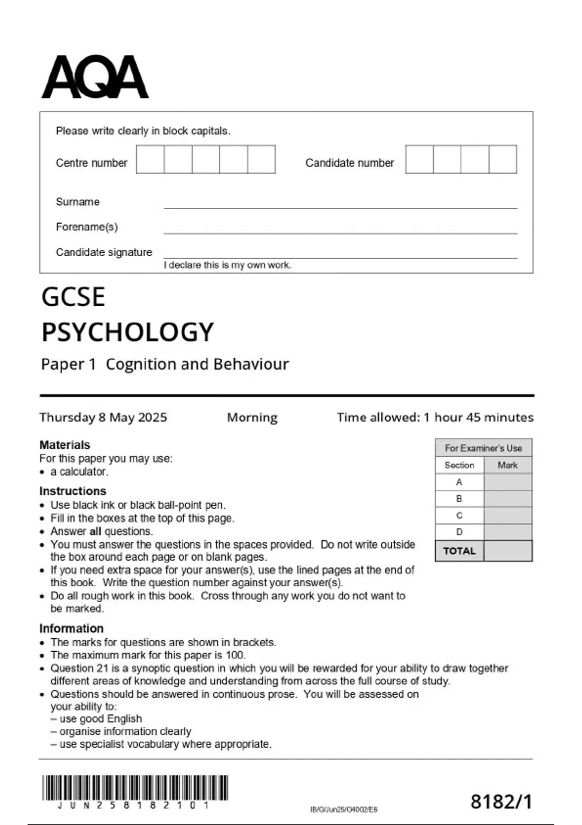 AQA Gcse Psychology 8182/1 paper 1 2025 Question Paper