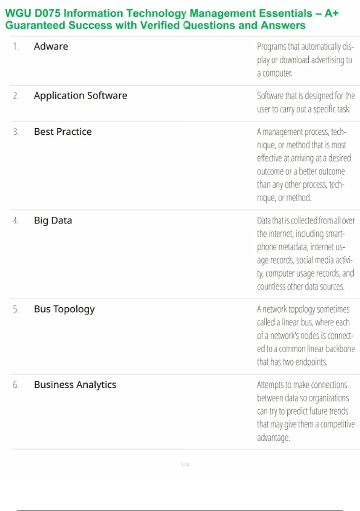 This WGU D075 Information Technology Management Essentials study guide is designed to help students understand how technology supports organizational strategy and management decisions. It includes verified questions and clearly explained answers covering IT governance, systems planning, project management basics, risk management, cybersecurity fundamentals, data management, and technology-enabled business processes. Carefully aligned with WGU D075 course competencies, this guide supports focused learning and exam readiness. Ideal for business and IT learners, it strengthens strategic thinking and provides a dependable pathway to guaranteed success and A+-level performance.