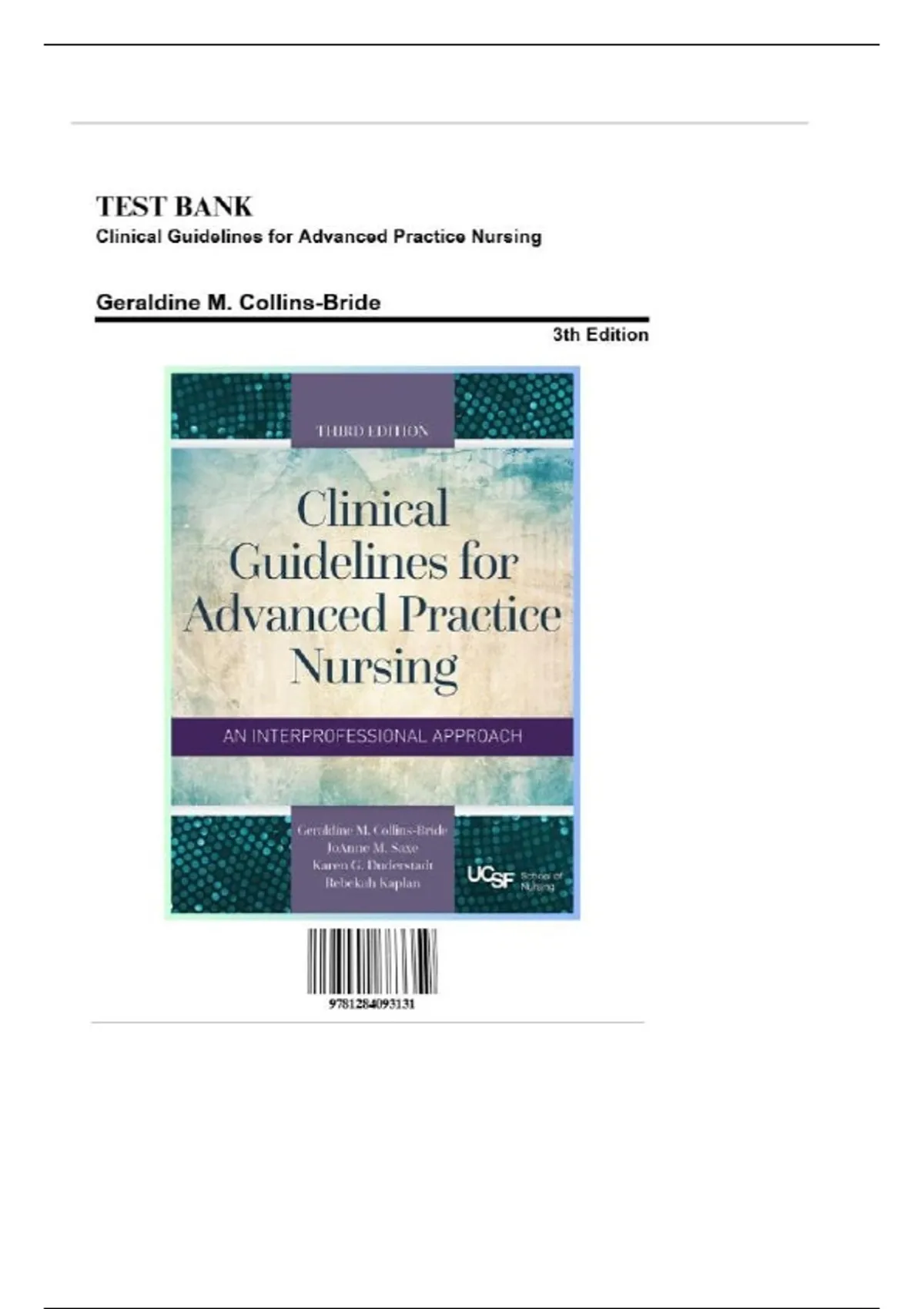 Test Bank for Clinical Guidelines for Advanced Practice Nursing, 3rd Edition by Geraldine M. Collins-Bride, 9781284093131, Covering Chapters 1-71 | Includes Rationales