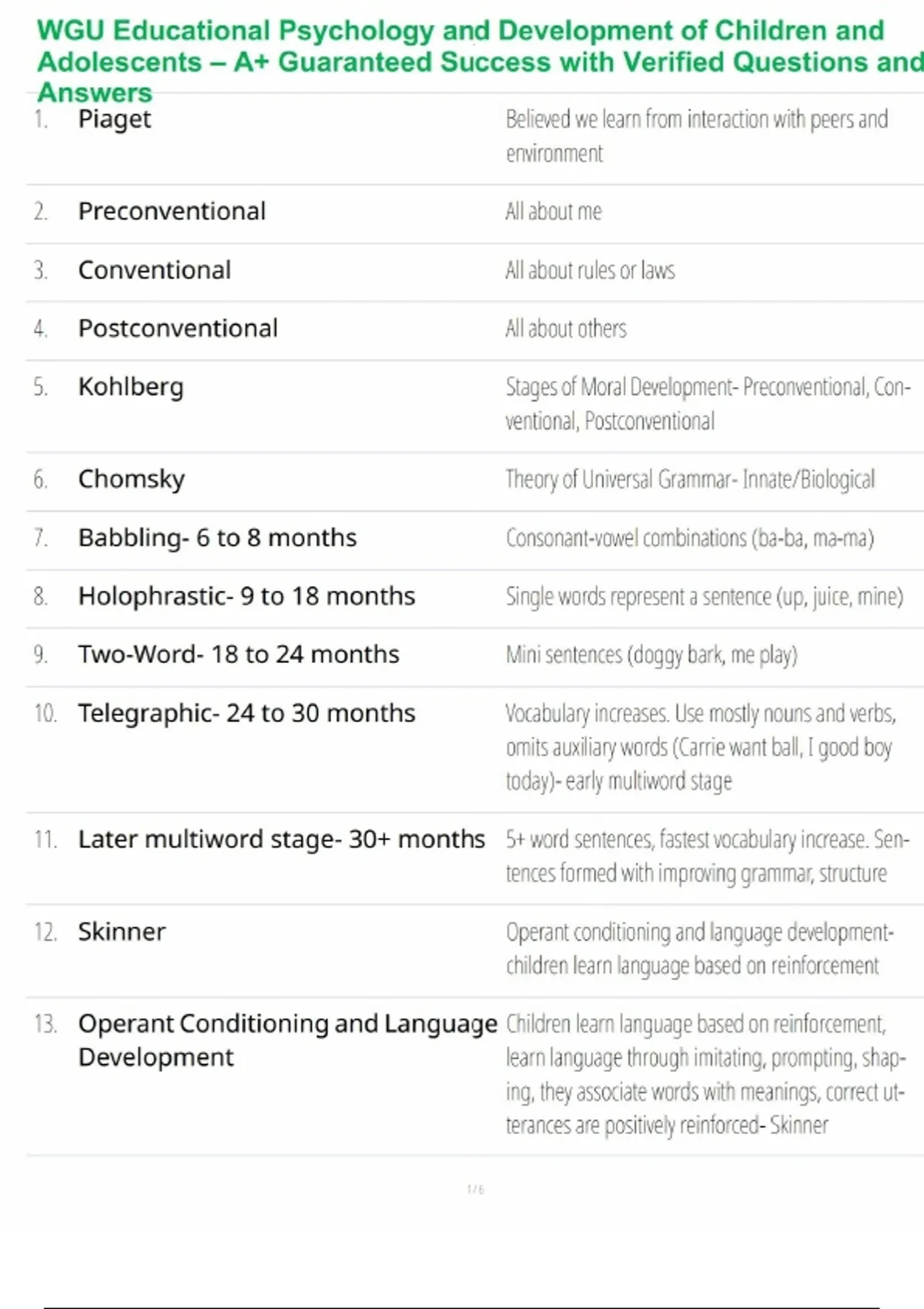 This WGU Educational Psychology and Development of Children and Adolescents study guide is designed to help students understand the psychological principles that influence learning and development. It includes verified questions and clearly explained answers covering cognitive, social, emotional, and moral development, learning theories, motivation, behavior management, and individual differences in educational settings. Carefully aligned with WGU course competencies, this guide supports focused study and exam readiness. Ideal for education students and aspiring teachers, it strengthens practical understanding and provides a reliable pathway to guaranteed success and A+-level performance.