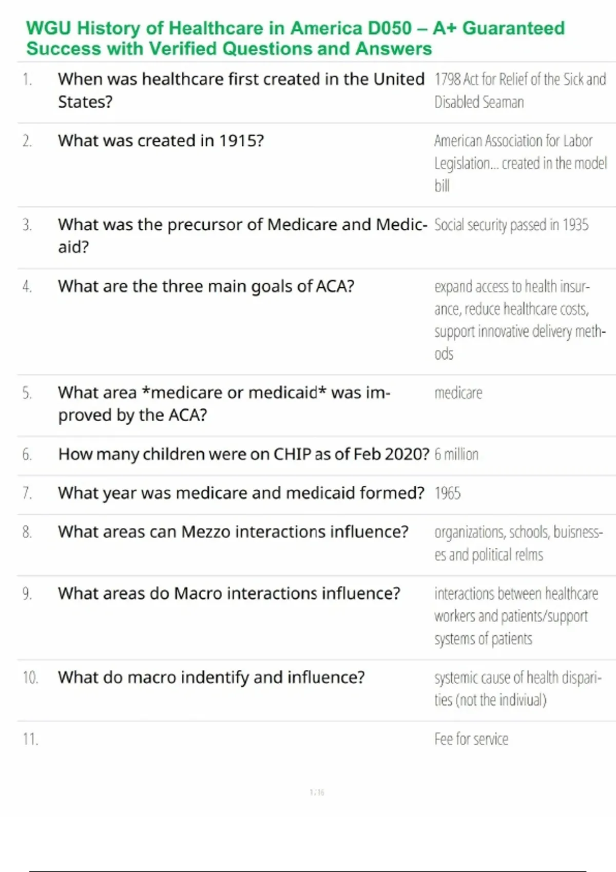 This WGU History of Healthcare in America D050 study guide is designed to help students understand the evolution of the American healthcare system and its impact on modern practice. It includes verified questions and clearly explained answers covering early medical practices, public health movements, healthcare reform, policy development, technological advancements, and ethical considerations in healthcare history. Carefully aligned with WGU D050 course competencies, this guide supports focused study and exam readiness. Ideal for healthcare students and professionals, it strengthens historical insight and provides a reliable pathway to guaranteed success and A+-level performance.