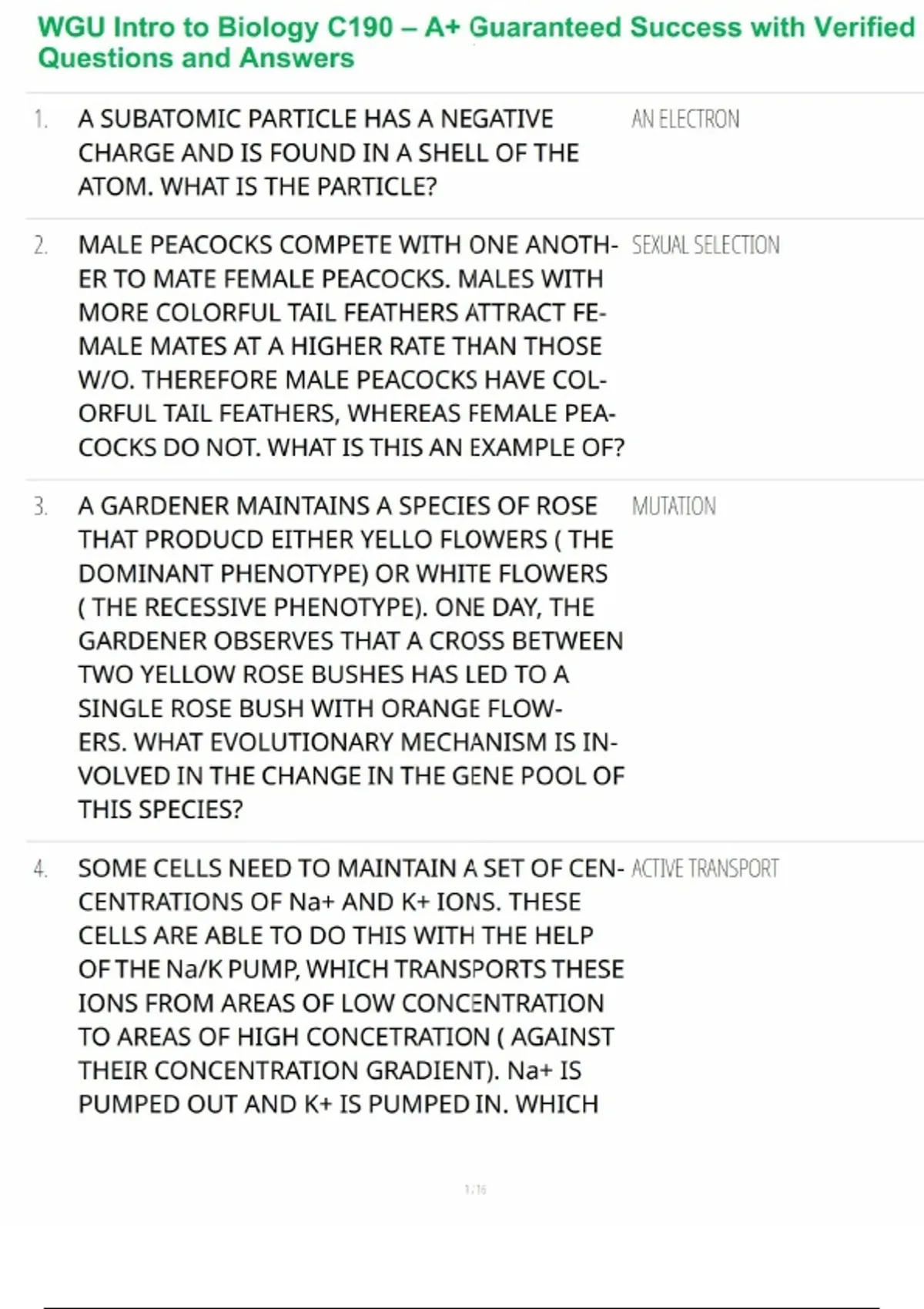 This WGU C190 Introduction to Biology study guide provides a clear and structured approach to mastering essential biological concepts. It includes verified questions and well-explained answers covering cell structure and function, biomolecules, enzymes, metabolism, genetics, evolution, and basic ecological principles. Designed to align closely with WGU C190 course competencies, the document supports efficient learning and exam-focused revision. Ideal for both beginners and returning students, this guide simplifies complex topics, strengthens scientific understanding, and offers a dependable pathway to A+-level performance and guaranteed success.