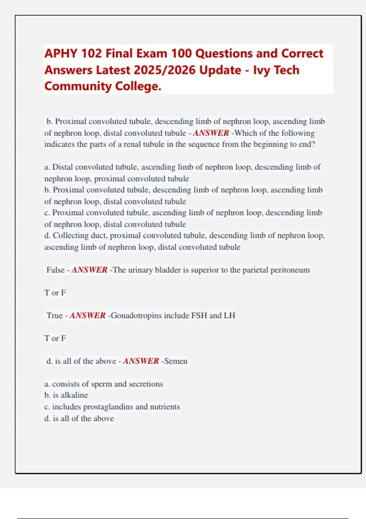 APHY 102 Final Exam 100 Questions and Correct Answers Latest 2025/2026 Update - Ivy Tech Community College. b. Proximal convoluted tubule, descending limb of nephron loop, ascending limb of nephron loop, distal convoluted tubule - ANSWER -Which of the following indicates the parts of a renal tubule in the sequence from the beginning to end? a. Distal convoluted tubule, ascending limb of nephron loop, descending limb of nephron loop, proximal convoluted tubule b. Proximal convoluted tubule, descending limb of nephron loop, ascending limb of nephron loop, distal convoluted tubule c. Proximal convoluted tubule, ascending limb of nephron loop, descending limb of nephron loop, distal convoluted tubule d. Collecting duct, proximal convoluted tubule, descending limb of nephron loop, ascending limb of nephron loop, distal convoluted tubule False - ANSWER -The urinary bladder is superior to the parietal peritoneum T or F True - ANSWER -Gonadotropins include FSH and LH T or F d. is all of the above - ANSWER -Semen a. consists of sperm and secretions b. is alkaline c. includes prostaglandins and nutrients d. is all of the above c. ejaculatory duct - ANSWER -The structure the sperm enters upon exiting the ductus deferens is the a. seminal vesicles b. rete testis c. ejaculatory duct d. epididymis d. androgens - ANSWER -The interstitial cells of the testes produce a. seminal fluid b. spermatogenic cells c. sperm cells d. androgens d. all of the above - ANSWER -Which of the following is (are) forms of contraception? a. Rhythm method b. Chemical barriers c. Intrauterine device d. all of the above b. epididymides - ANSWER -Sperm cells mature in the a. ejaculatory ducts b. epididymides c. semical vesicles d. ductus deferentia c. stimulates uterine wall development; stimulates the uterine lining to become more glandular - ANSWER -In the reproductive cycle, estrogen _________, whereas progestrone _________ a. Inhibits the release of FSH; stimulates the release of FSH b. ejects milk from the mammary glands; stimulates milk secretion c. stimulates uterine wall development; stimulates the uterine lining to become more glandular d. stimulates erection of the clitoris; stimulates the uterine lining to become glandular a. cervix - ANSWER -The tubular part of the uterus that extends downward into the upper vagina is the a. cervix b. endometrium c. fundus d. perimetrium a. uterine tube - ANSWER -Fertilization normally occurs in the a. uterine tube b. uterus c. vagina d. perimetrium b. tissue resembling the inner uterine lining grows in the abdominal cavity - ANSWER -In endometriosis a. tissue resembling the inner uterine lining grows in the thoracic cavity b. tissue resembling the inner uterine lining grows in the abdominal cavity c. the inner uterine lining tissue no longer grows during the womans reproductive cycles d. a new mother becomes extremely depressed. True - ANSWER -Primary oocyte production begins before birth. T or F