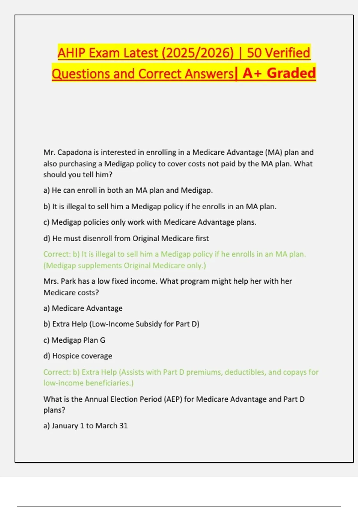 AHIP Exam Latest (2025/2026) | 50 Verified Questions and Correct Answers| A+ Graded