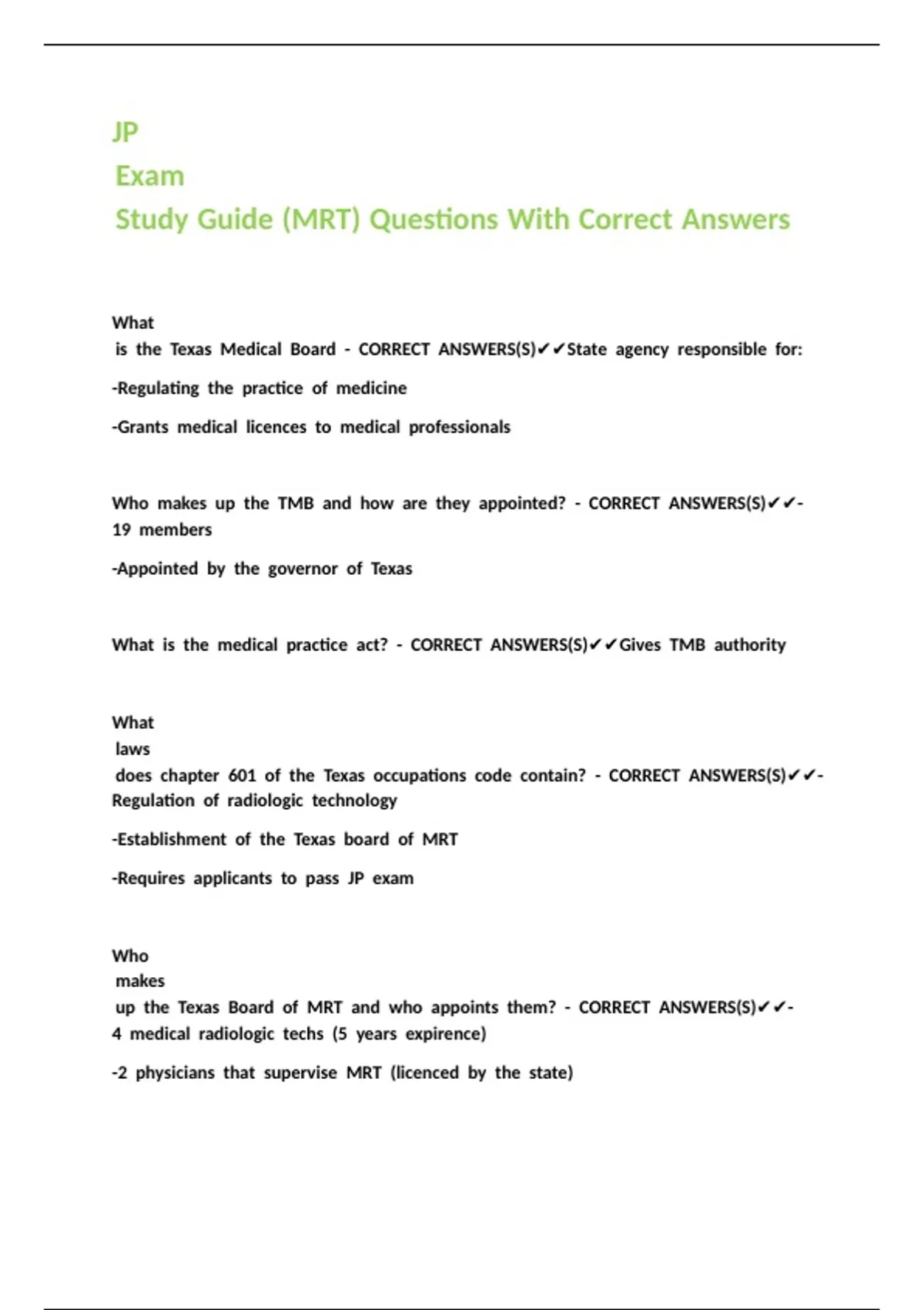 Study Guide (MRT) Questions With Correct Answers