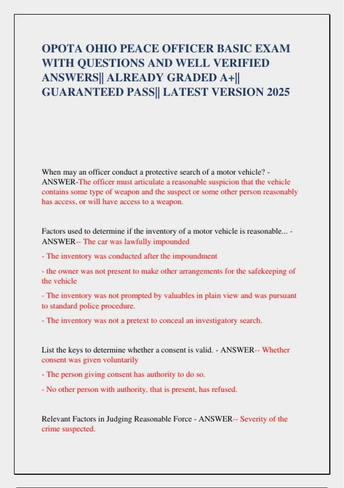 OPOTA OHIO PEACE OFFICER BASIC EXAM WITH QUESTIONS AND WELL VERIFIED ANSWERS|| ALREADY GRADED A+|| GUARANTEED PASS|| LATEST VERSION 2025 When may an officer conduct a protective search of a motor vehicle? - ANSWER-The officer must articulate a reasonable suspicion that the vehicle contains some type of weapon and the suspect or some other person reasonably has access, or will have access to a weapon. Factors used to determine if the inventory of a motor vehicle is reasonable... - ANSWER-- The car was lawfully impounded - The inventory was conducted after the impoundment - the owner was not present to make other arrangements for the safekeeping of the vehicle - The inventory was not prompted by valuables in plain view and was pursuant to standard police procedure. - The inventory was not a pretext to conceal an investigatory search. List the keys to determine whether a consent is valid. - ANSWER-- Whether consent was given voluntarily - The person giving consent has authority to do so. - No other person with authority, that is present, has refused. Relevant Factors in Judging Reasonable Force - ANSWER-- Severity of the crime suspected. - Whether the suspect is an immediate thereat to safety of officer or others. - Whether suspect is actively resisting - Whether the suspect was attempting to evade arrest by flight. Differences In the two types of Resistance - ANSWER-Passive Resistance- when a person exhibits no resistive movement in response to verbal and other direction. Active Resistance - when a person exhibits resistive movement to avoid physical control or, as a passive resistor, presents a credible threat to an officer. When may handcuffing may be considered unreasonable force? - ANSWER-- The forth amendment prohibits unduly tight or excessively forceful handcuffing during the course of a seizure. - Absent exigent circumstances, an officer choosing to handcuff a peaceable arrest in a manner likely to cause serious harm amounts to excessive force. - An officer cannot make a cursory examination of a severe, obvious medical injury and, nevertheless, choose to handcuff the arrestee in a manner likely to cause serious harm. - Excessive claim * Plaintiff complained of tight handcuffs * Officer ignored complaints * Plaintiff experienced some physical injury resulting from handcuffing. When can using chemical weapons may be considered unreasonable? - ANSWER-- When weapons are used on an arrestee who has already been subdued and poses no threat. - Using a weapon on someone who is already handcuffed, especially in a cruiser. Criteria that must be met before initiating an AMBER alert - ANSWER-- Confirmation that the child is under 18 years old. - Abduction poses credible risk of danger, serious bodily harm or death. - Sufficient descriptive info about the child, suspect, and circumstances surrounding the abduction. - The child is not a runaway and has not been abducted as a result of a family abduction, unless the investigation determines the child is in immediate danger of serious bodily harm or death. Criteria that must be met before activating an endangered missing child alert. - ANSWER-- under 18 - The missing child is lost or a non-witnessed abduction. - The child's whereabouts are unknown - The disappearance of the child poses a credible threat of immediate or serious bodily harm of death to the child. When a person is missing , 21yrs old or older and foul play I suspected - ANSWER-- All info contained in the report must be entered into NCIC within 7 days. -Officer is strongly encouraged to enter info immediately. Criteria that must be met before activating an endangered missing adult alert. - ANSWER--Person is confirmed missing - 65 + and has mental impairment - The disappearance of the individual poses a credible threat of immediate danger of serious bodily harm or death. - There is sufficient descriptive info about the individual and the circumstances surrounding the individuals disappearance to indicate that activation of the alert will help locate the individual. Criteria that must be met before activating a Blue Alert - ANSWER-- Law enforcement agency confirmation that LEO has been seriously hurt or killed and the suspect has not been apprehended or LEO is missing while on duty under circumstances warranting concern.