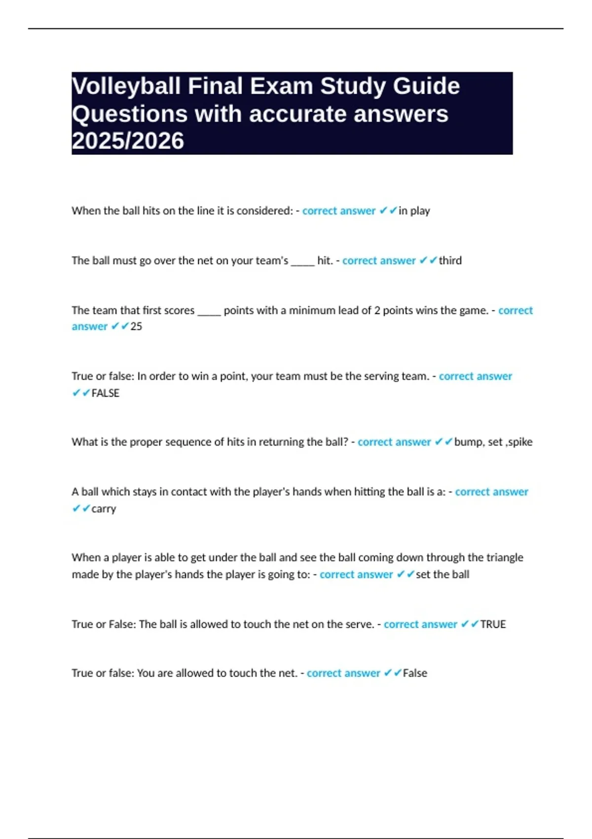 True or False: The ball is allowed to touch the net on the serve. - correct answer ✔✔TRUE