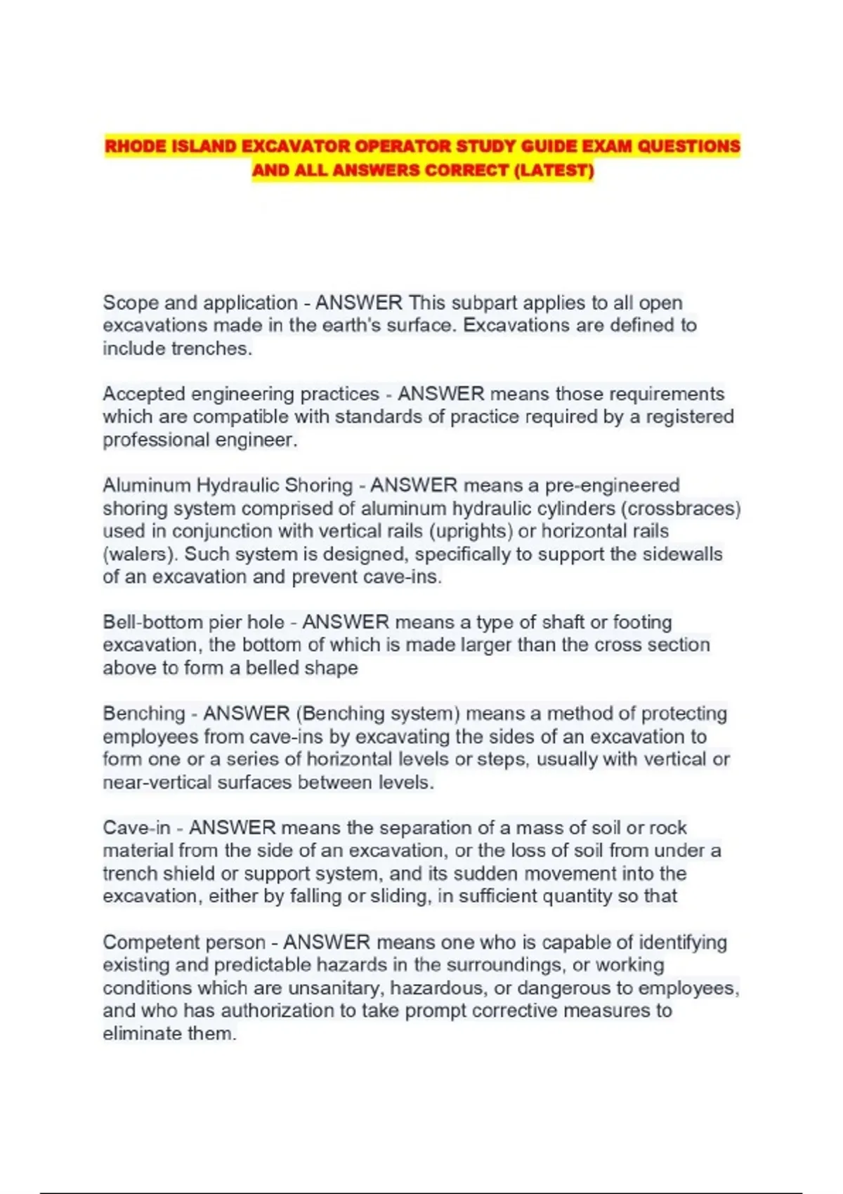 RHODE ISLAND EXCAVATOR OPERATOR STUDY GUIDE EXAM QUESTIONS AND ALL ANSWERS CORRECT (LATEST)....