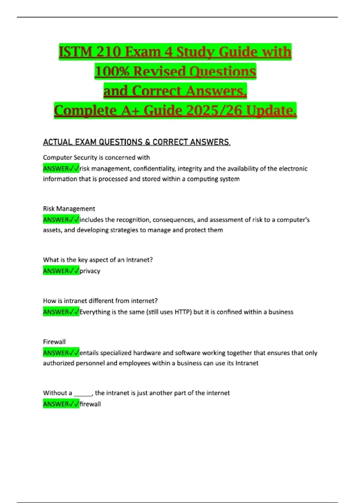 This document provides a fully revised study guide for ISTM 210 Exam 4, featuring updated exam questions and verified correct answers. It covers the advanced and integrative information systems topics, enterprise applications, security considerations, and strategic use of technology typically assessed in the fourth exam of the course. The material is organized to deliver a clear, accurate, and comprehensive review aligned with the 2025/26 curriculum update.This document provides a fully revised study guide for ISTM 210 Exam 4, featuring updated exam questions and verified correct answers. It covers the advanced and integrative information systems topics, enterprise applications, security considerations, and strategic use of technology typically assessed in the fourth exam of the course. The material is organized to deliver a clear, accurate, and comprehensive review aligned with the 2025/26 curriculum update.This document provides a fully revised study guide for ISTM 210 Exam 4, featuring updated exam questions and verified correct answers. It covers the advanced and integrative information systems topics, enterprise applications, security considerations, and strategic use of technology typically assessed in the fourth exam of the course. The material is organized to deliver a clear, accurate, and comprehensive review aligned with the 2025/26 curriculum update.