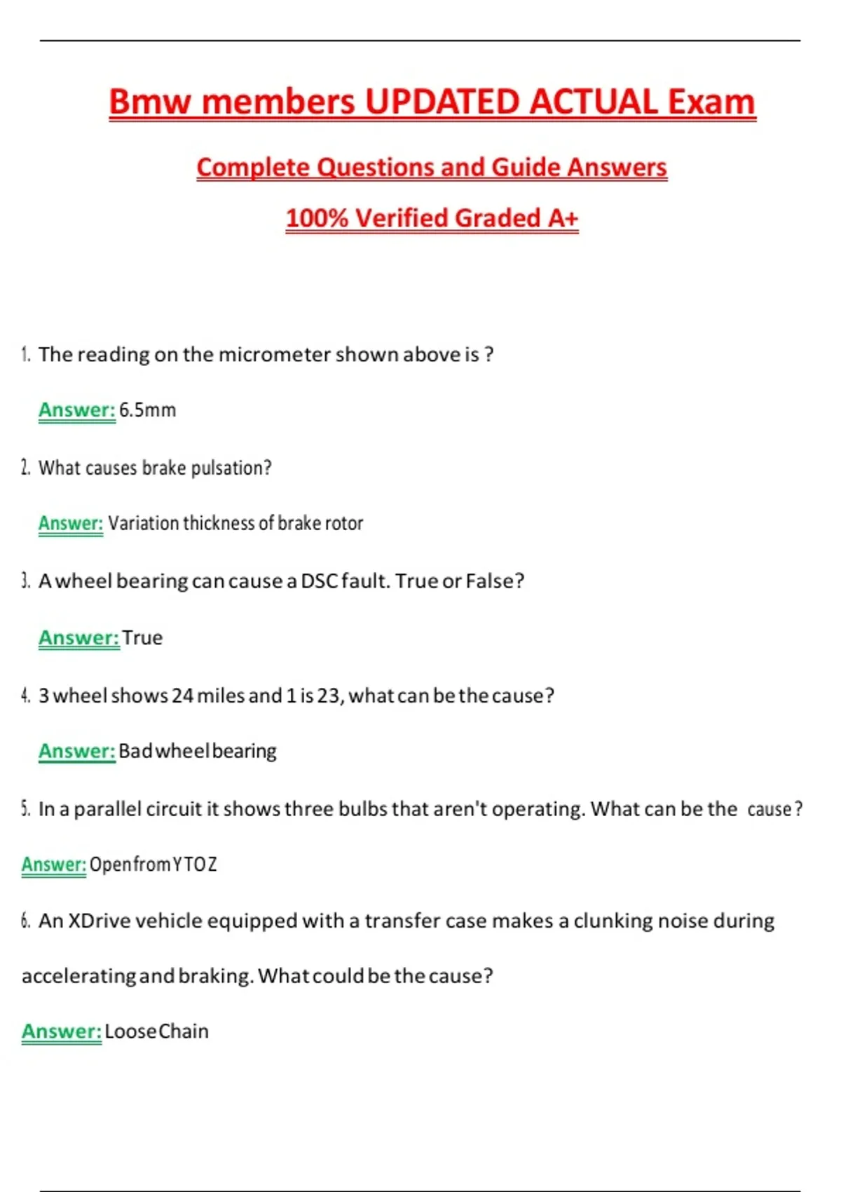 BMW Members Actual Exam 2026 Complete Questions and Guide Answers, 100% Verified Graded A+ Ace your BMW Members Actual Exam with this INSTANT PDF DOWNLOAD, crafted for automotive professionals, technicians, and certification candidates seeking authentic exam practice. This resource features real exam-style questions and detailed answers, allowing you to simulate the actual test environment and identify areas for improvement. The guide covers all core BMW membership exam topics, including vehicle systems, diagnostics, maintenance protocols, repair procedures, and safety standards, providing a comprehensive study solution for both beginners and experienced professionals. BMW Members exam, BMW actual exam 2026, BMW certification test, BMW study guide PDF, automotive technician exam, BMW vehicle systems questions, BMW diagnostics exam, maintenance protocols test, repair procedures exam, BMW safety standards exam, BMW exam practice PDF, BMW mock exam, BMW exam review, automotive certification prep, BMW membership exam prep, instant PDF BMW exam, BMW exam answers, BMW practice questions, BMW technician exam prep, BMW certification study material, real BMW exam questions