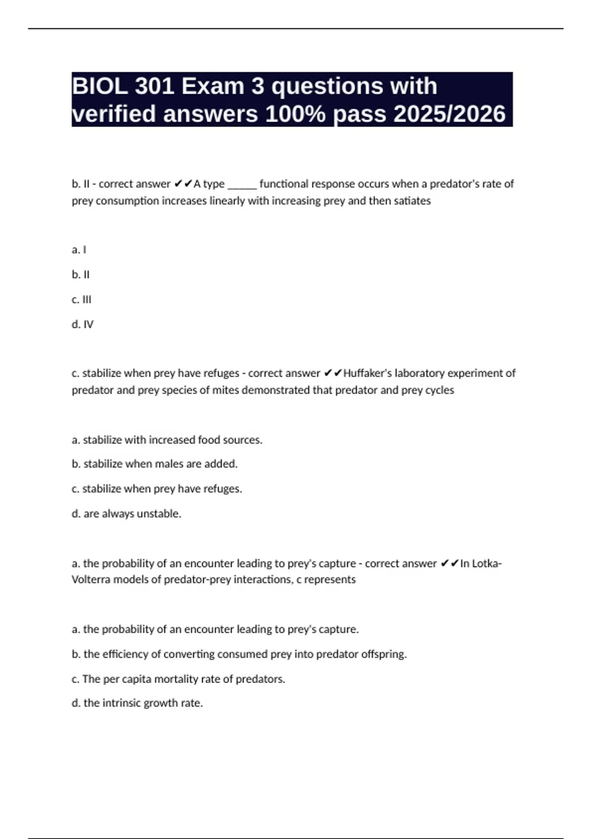 BIOL 301 Exam 3 questions with verified answers 100% pass 2025/2026