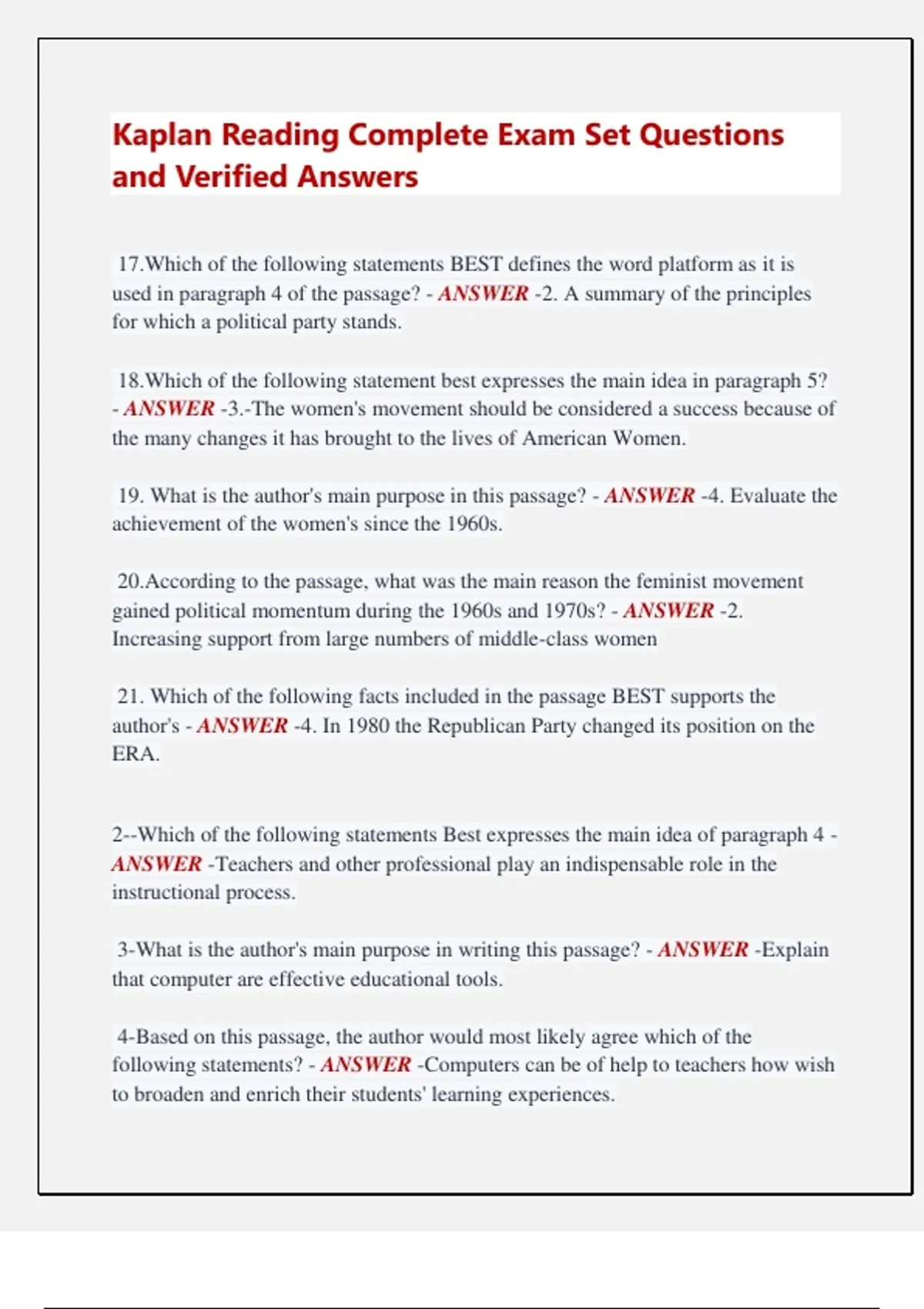 Kaplan Reading Complete Exam Set Questions and Verified Answers 17.Which of the following statements BEST defines the word platform as it is used in paragraph 4 of the passage? - ANSWER -2. A summary of the principles for which a political party stands. 18.Which of the following statement best expresses the main idea in paragraph 5? - ANSWER -3.-The women's movement should be considered a success because of the many changes it has brought to the lives of American Women. 19. What is the author's main purpose in this passage? - ANSWER -4. Evaluate the achievement of the women's since the 1960s. 20.According to the passage, what was the main reason the feminist movement gained political momentum during the 1960s and 1970s? - ANSWER -2. Increasing support from large numbers of middle-class women 21. Which of the following facts included in the passage BEST supports the author's - ANSWER -4. In 1980 the Republican Party changed its position on the ERA. 2--Which of the following statements Best expresses the main idea of paragraph 4 - ANSWER -Teachers and other professional play an indispensable role in the instructional process. 3-What is the author's main purpose in writing this passage? - ANSWER -Explain that computer are effective educational tools. 4-Based on this passage, the author would most likely agree which of the following statements? - ANSWER -Computers can be of help to teachers how wish to broaden and enrich their students' learning experiences. 5-Which of the following remarks made by the writer expresses a fact rather than an opinion? - ANSWER -• Teachers instruct students in different ways, by presenting information to large groups,small groups,or individual. 6--Which of the following lists of topics best organizes the information presented in the selection? 1-Basic approaches to child education 2-Guidelines for classroom of the computer 3-Teachers' opinions of computers 4-Library medical specialists' opinions of computers 1-Availabie education software 2-Common classroom problems 3-The need for individualized instruction 4-Advantages and drawbacks of computers 1-Instructional approaches and computers 2-The value of computerin educating students 3-The importanceof the educational professional 4-The value of microcomputers for classroom instruction 1-What teachers believe about educating students 2-Computers use and "slow leamers" 3-Negative and positive effects of the computer on the classroom environment 4-Impact of computers on teacers'workload - ANSWER -1-Instructional approaches and computers 2-The value of computerin educating students 3-The importanceof the educational professional 4-The value of microcomputers for classroom instruction 7---Which of the following statements best defines the word obliterate as it is used in paragraph 3? 1. Erase. 2. Blend. 3. Explode. 4.Transform. - ANSWER -1. Erase. 8---Which of the following statements best expresses the main idea of the passage - ANSWER -2. The events leading to the information of the lakes are complex, but the lakes' history is largely understood. 9-According to the passage, Lake Superior is located on which of the following - ANSWER -4. A structural basin of Precambrian rocks. 10-According to the passage,when did Great Lakes begin to form? - ANSWER -1. Toward the end of the Wisconsin glaciations. 12--Which of the following statement best expresses the main idea of paragraph 2? - ANSWER -Individual freedom must be somewhat limited if public order and the right of others are to be preserved. 13-For what purpose does the author include a statement by Justice. In the second paragraph of the passage? - ANSWER -2. To illustrate a point. 14-According to the passage,how were the Warren Court and Burger Court different? - ANSWER -1.The Warren Court was more favorable to the rights of prosecutors than was the Burger Court. 15-Which of the following assumption is most central to the views expressed by the author of this passage? - ANSWER -1. Personal freedom-can be limited without harming a society's democratic nature. 16--Which of the following list of topics BEST organize information in the selection? - ANSWER -Limits to personal freedom in a democratic society The problem of defining individual right and community needs .How the Supreme Court has tried to address the problem