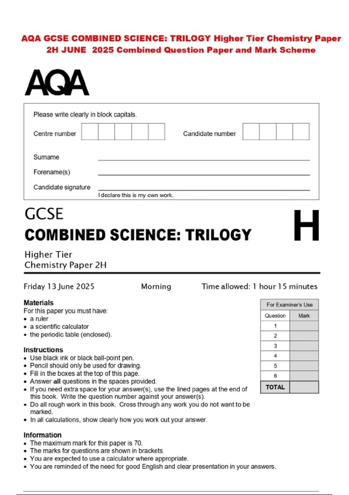 AQA GCSE COMBINED SCIENCE: TRILOGY Higher Tier Chemistry Paper 2H JUNE 2025 Combined Question Paper and Mark Scheme