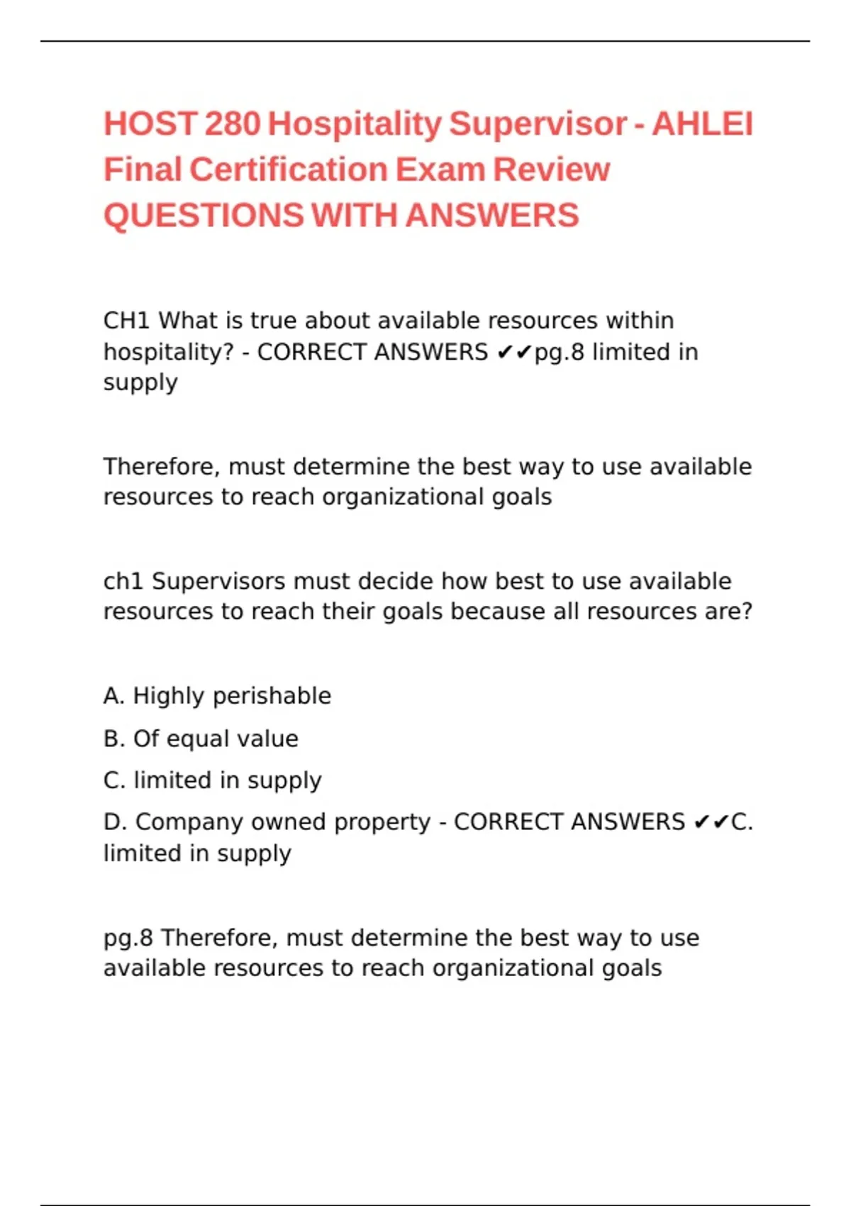 HOST 280 Hospitality Supervisor - AHLEI Final Certification Exam Review QUESTIONS WITH ANSWERS