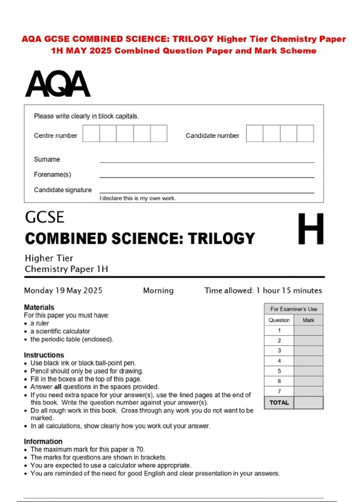 AQA GCSE COMBINED SCIENCE: TRILOGY Higher Tier Chemistry Paper 1H MAY 2025 Combined Question Paper and Mark Scheme