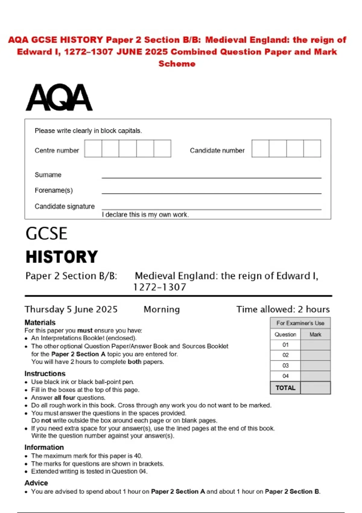 AQA GCSE HISTORY Paper 2 Section B/B: Medieval England: the reign of Edward I, 1272–1307 JUNE 2025 Combined Question Paper and Mark Scheme