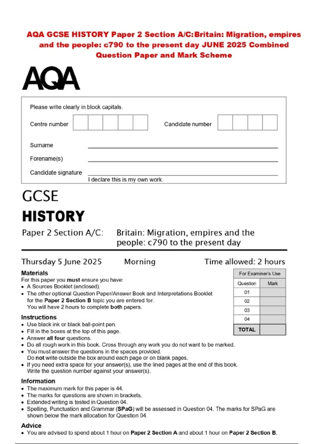 AQA GCSE HISTORY Paper 2 Section A/C: Britain: Migration, empires and the people: c790 to the present day JUNE 2025 Combined Question Paper and Mark Scheme