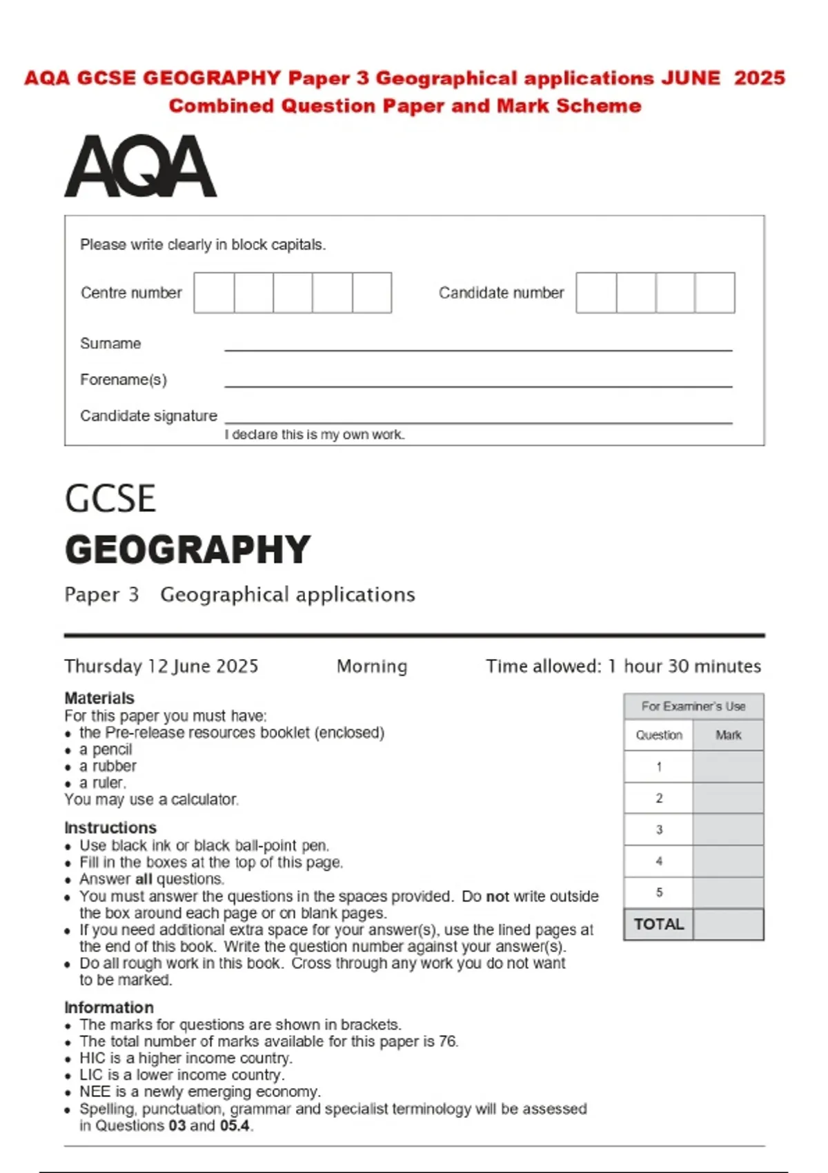 AQA GCSE GEOGRAPHY Paper 3 Geographical applications JUNE 2025 Combined Question Paper and Mark Scheme