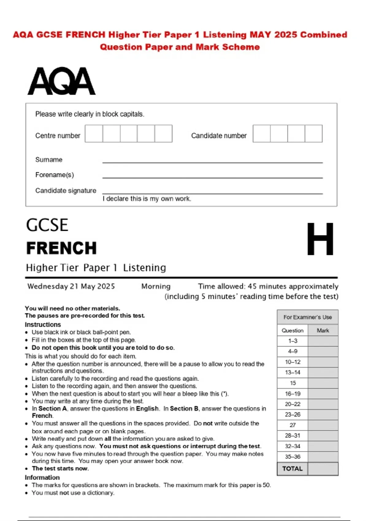 AQA GCSE FRENCH Higher Tier Paper 1 Listening MAY 2025 Combined Question Paper and Mark Scheme