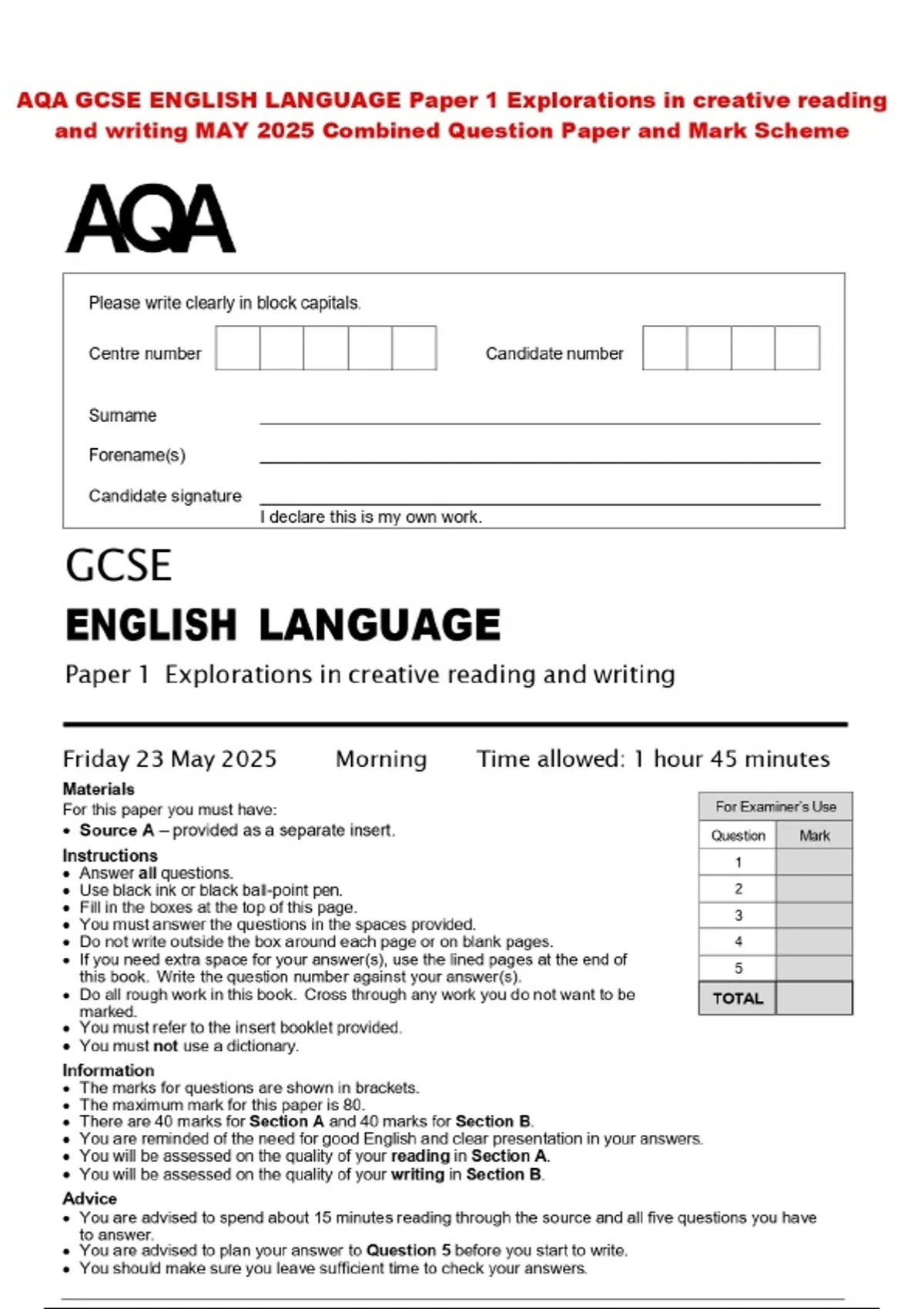 AQA GCSE ENGLISH LANGUAGE Paper 1 Explorations in creative reading and writing MAY 2025 Combined Question Paper and Mark Scheme