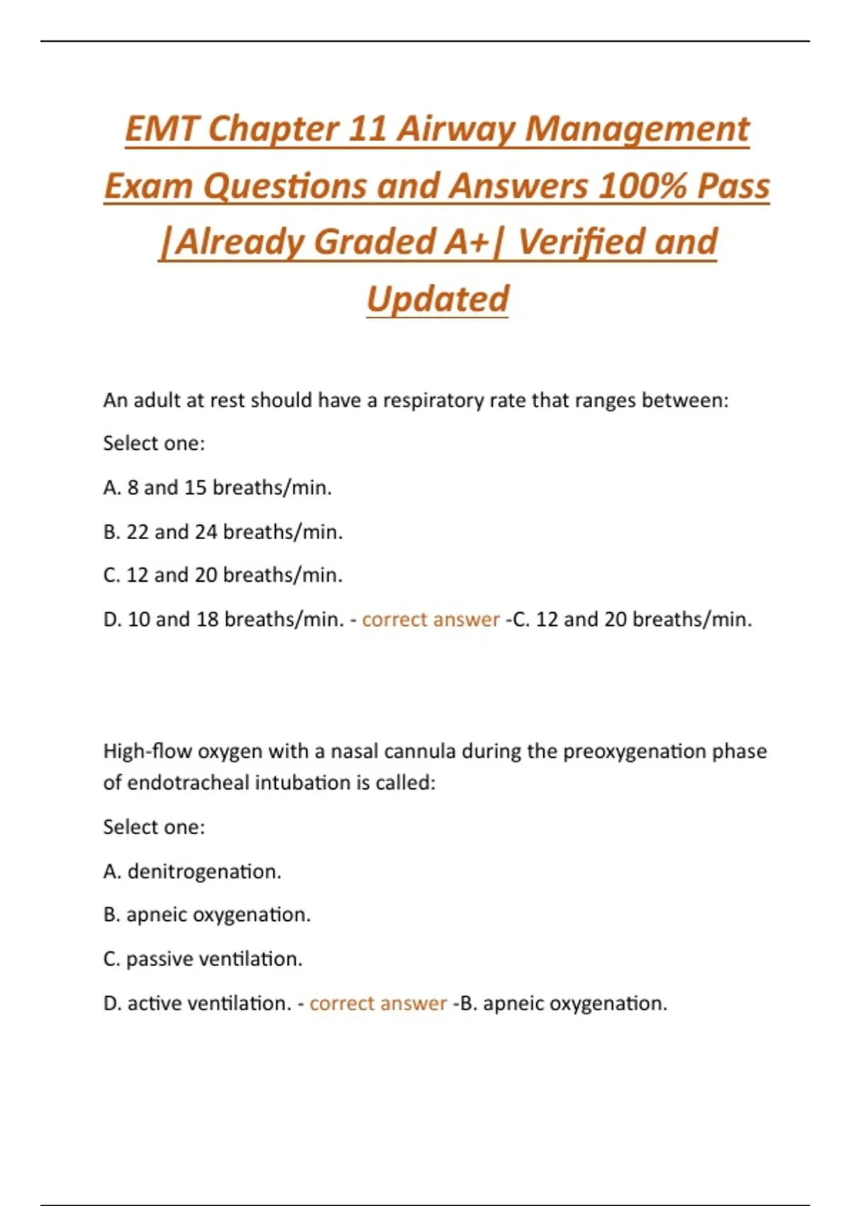 EMT Chapter 11 Airway Management Exam Questions and Answers 100% Pass |Already Graded A+| Verified and Updated