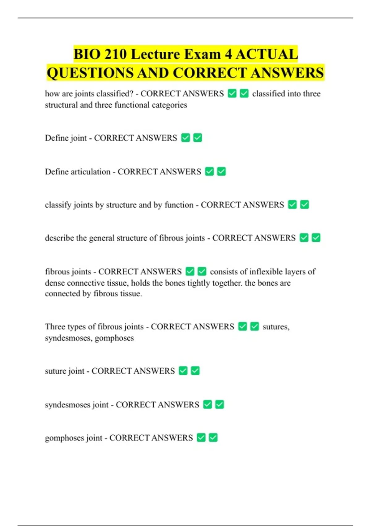BIO 210 Lecture Exam 4 ACTUAL QUESTIONS AND CORRECT ANSWERS how are joints classified? - CORRECT ANSWERS structural and three functional categories Define joint - CORRECT ANSWERS
