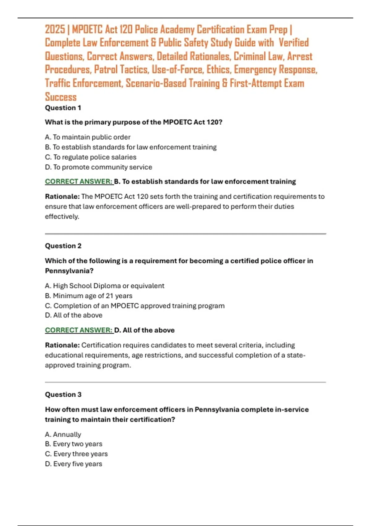 Rationale: The MPOETC Act 120 sets forth the training and certification requirements to