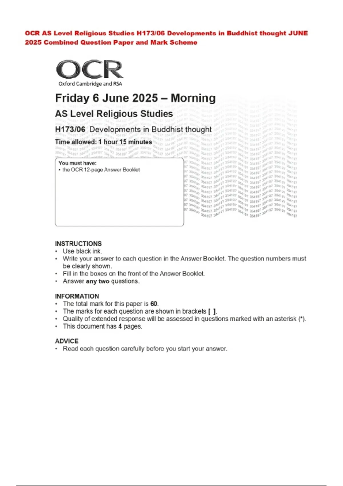 OCR AS Level Religious Studies H173/06 Developments in Buddhist thought JUNE 2025 Combined Question Paper and Mark Scheme