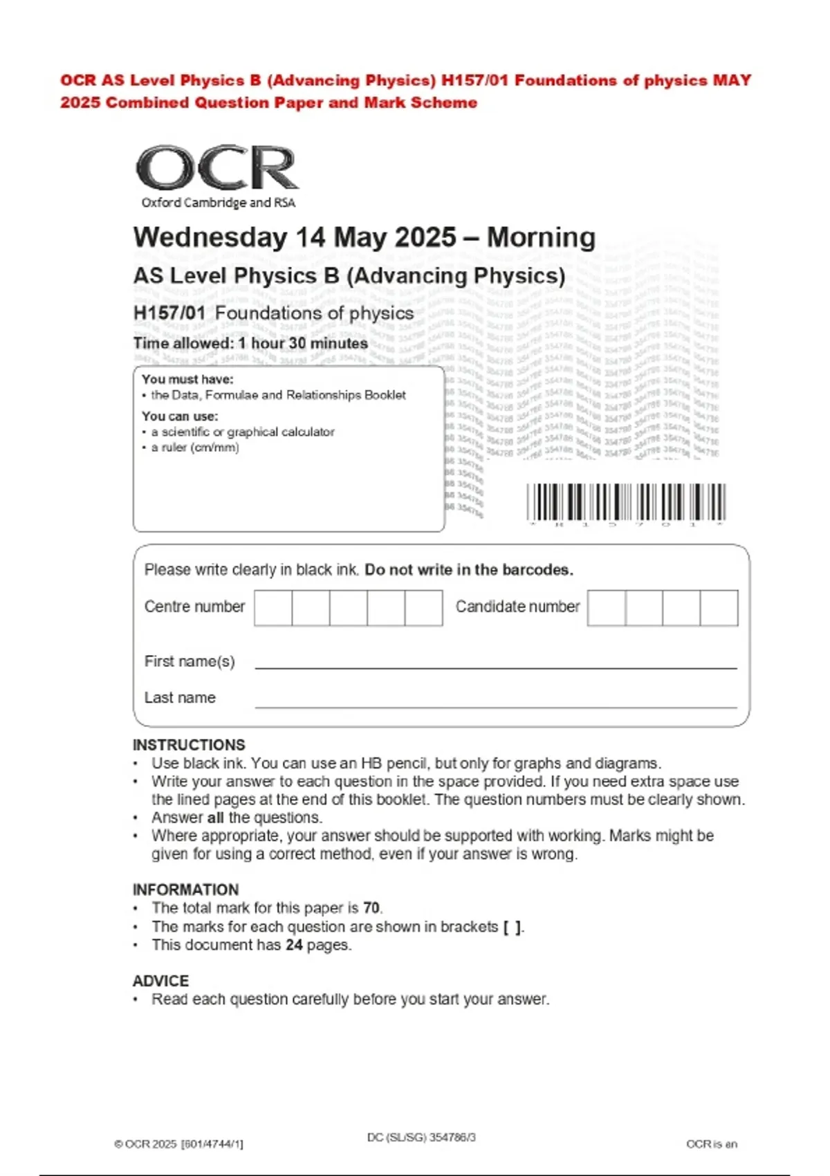 OCR AS Level Physics B (Advancing Physics) H157/01 Foundations of physics MAY 2025 Combined Question Paper and Mark Scheme