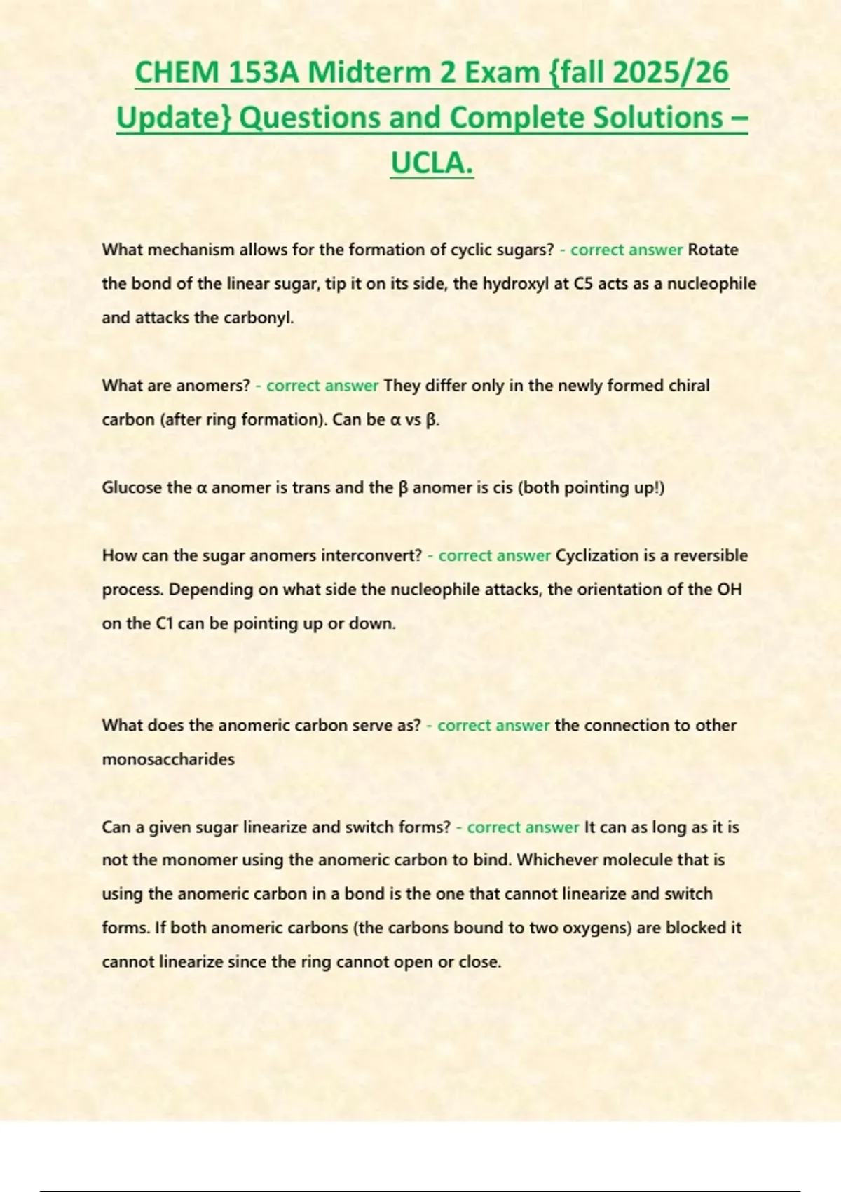 CHEM 153A Midterm 2 Exam {fall 2025/26 Update} Questions and Complete Solutions – UCLA. What mechanism allows for the formation of cyclic sugars? - correct answer Rotate the bond of the linear sugar, tip it on its side, the hydroxyl at C5 acts as a nucleophile and attacks the carbonyl. What are anomers? - correct answer They differ only in the newly formed chiral carbon (after ring formation). Can be α vs β. Glucose the α anomer is trans and the β anomer is cis (both pointing up!) How can the sugar anomers interconvert? - correct answer Cyclization is a reversible process. Depending on what side the nucleophile attacks, the orientation of the OH on the C1 can be pointing up or down. What does the anomeric carbon serve as? - correct answer the connection to other monosaccharides Can a given sugar linearize and switch forms? - correct answer It can as long as it is not the monomer using the anomeric carbon to bind. Whichever molecule that is using the anomeric carbon in a bond is the one that cannot linearize and switch forms. If both anomeric carbons (the carbons bound to two oxygens) are blocked it cannot linearize since the ring cannot open or close. Glycosidic bonds - correct answer covalent bonds that form between the hemiacetal group of a carbohydrate and a hydroxyl group on another compound (like other carbohydrates). This is how polysaccharides form. β-1,4-glycosidic bonds - correct answer lactose
