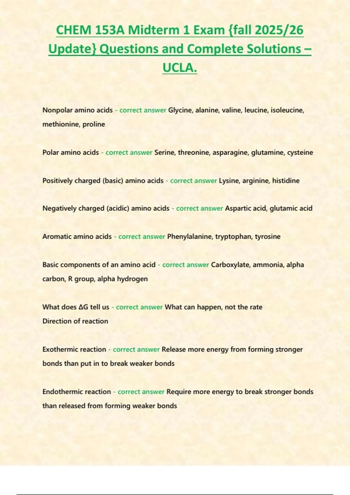 CHEM 153A Midterm 1 Exam {fall 2025/26 Update} Questions and Complete Solutions – UCLA. Nonpolar amino acids - correct answer Glycine, alanine, valine, leucine, isoleucine, methionine, proline Polar amino acids - correct answer Serine, threonine, asparagine, glutamine, cysteine Positively charged (basic) amino acids - correct answer Lysine, arginine, histidine Negatively charged (acidic) amino acids - correct answer Aspartic acid, glutamic acid Aromatic amino acids - correct answer Phenylalanine, tryptophan, tyrosine Basic components of an amino acid - correct answer Carboxylate, ammonia, alpha carbon, R group, alpha hydrogen What does ∆G tell us - correct answer What can happen, not the rate Direction of reaction Exothermic reaction - correct answer Release more energy from forming stronger bonds than put in to break weaker bonds Endothermic reaction - correct answer Require more energy to break stronger bonds than released from forming weaker bonds What entropy is favorable? - correct answer +∆S What enthalpy is favorable? - correct answer -∆H (more energy released than required)