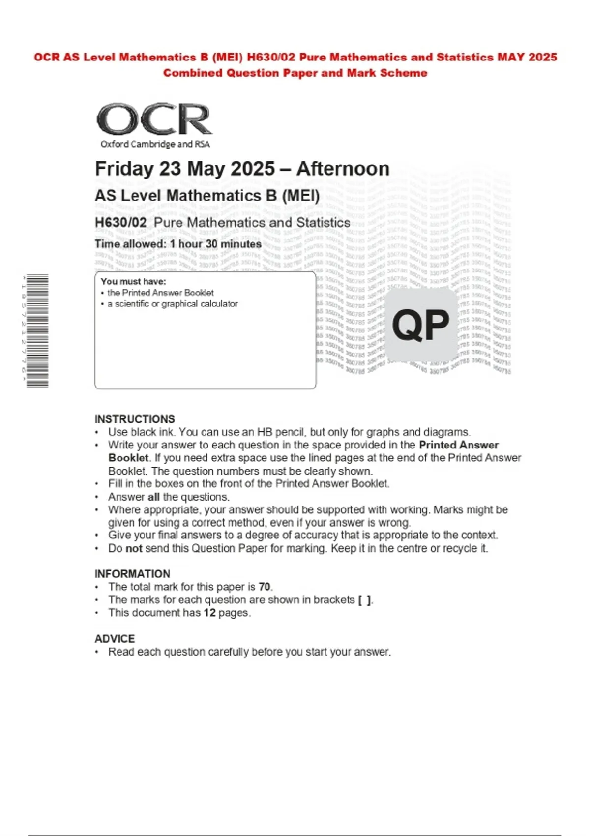 OCR AS Level Mathematics B (MEI) H630/02 Pure Mathematics and Statistics MAY 2025 Combined Question Paper and Mark Scheme