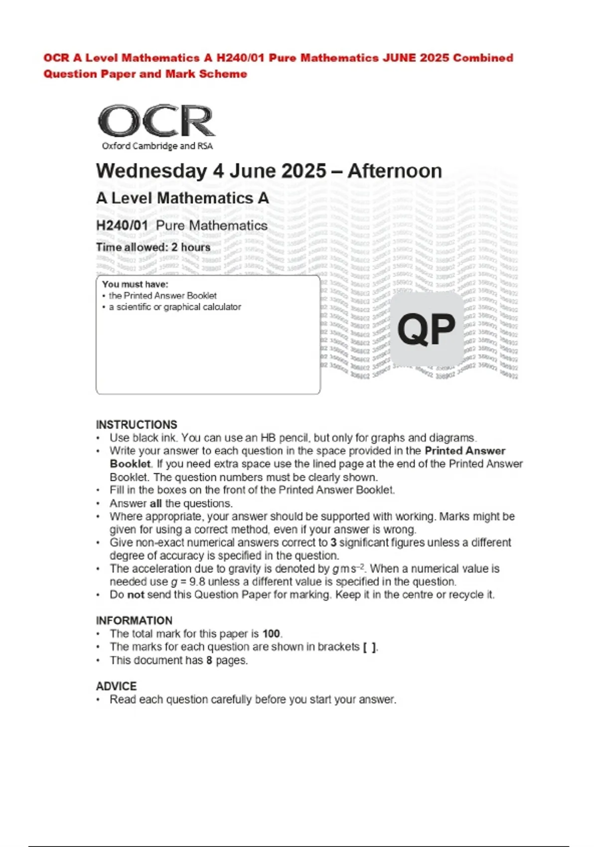 BUNDLE::: OCR A Level Mathematics 2025 Combined Question Paper and Mark Scheme
