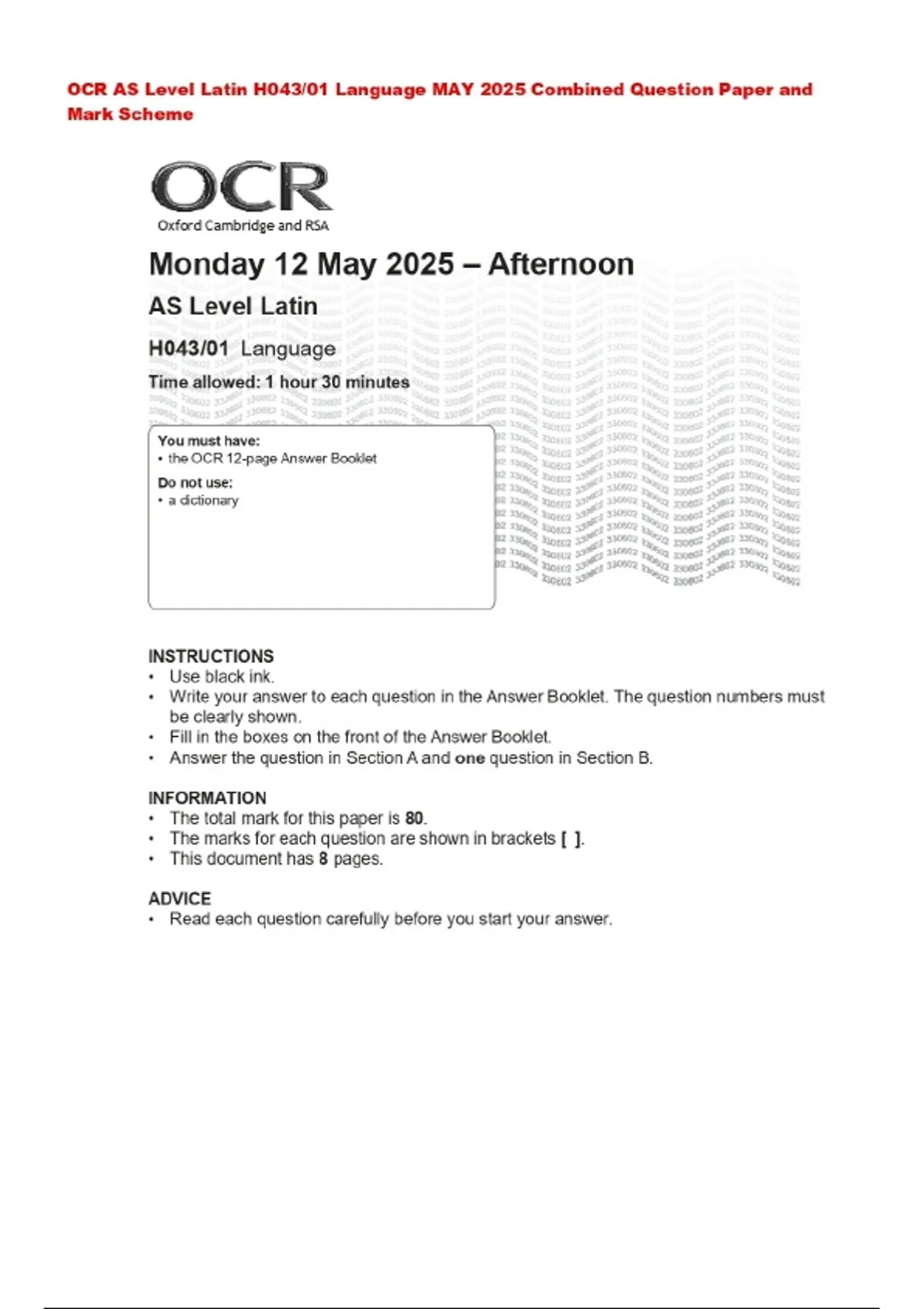 BUNDLE::: OCR AS Level Latin 2025 Combined Question Paper and Mark Scheme