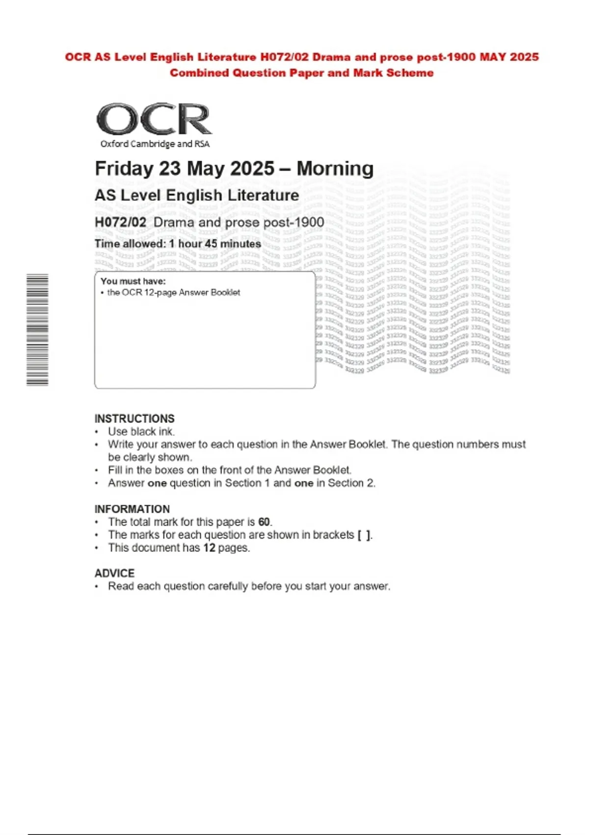 OCR AS Level English Literature H072/02 Drama and prose post-1900 MAY 2025 Combined Question Paper and Mark Scheme