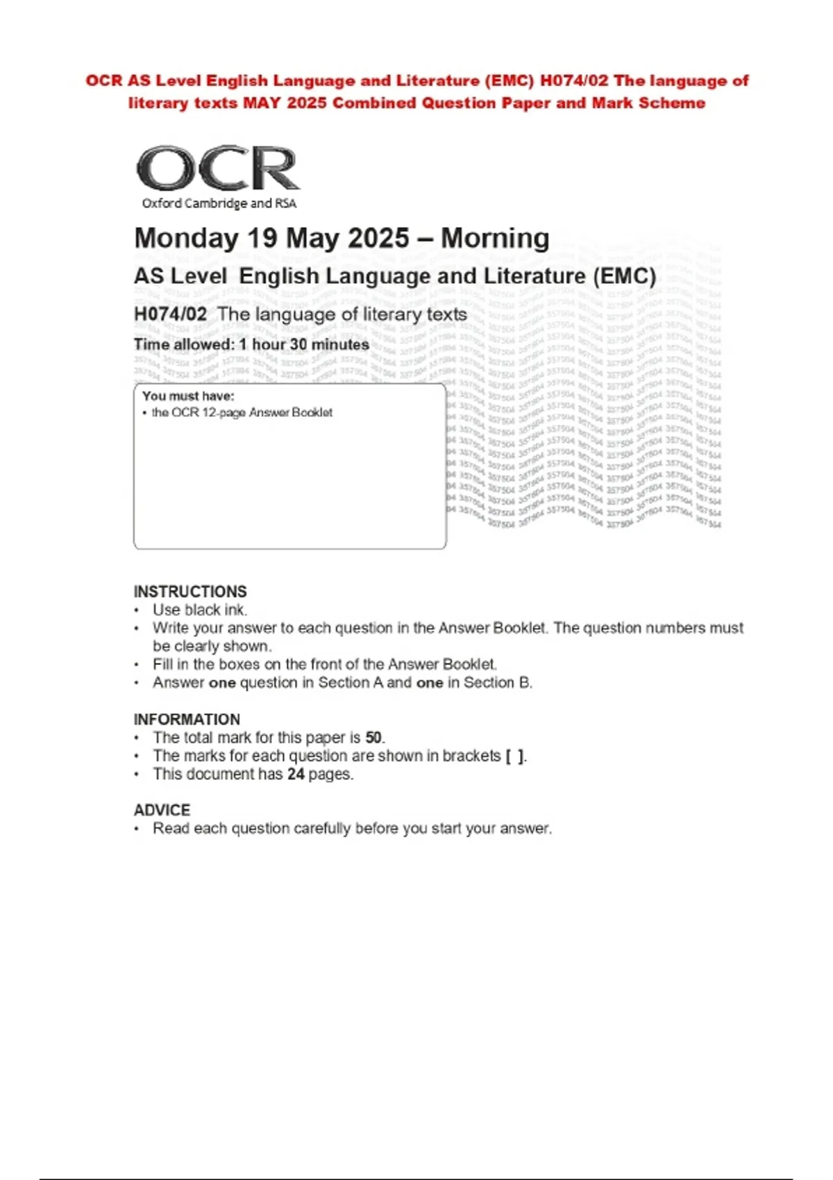 OCR AS Level English Language and Literature (EMC) H074/02 The language of literary texts MAY 2025 Combined Question Paper and Mark Scheme