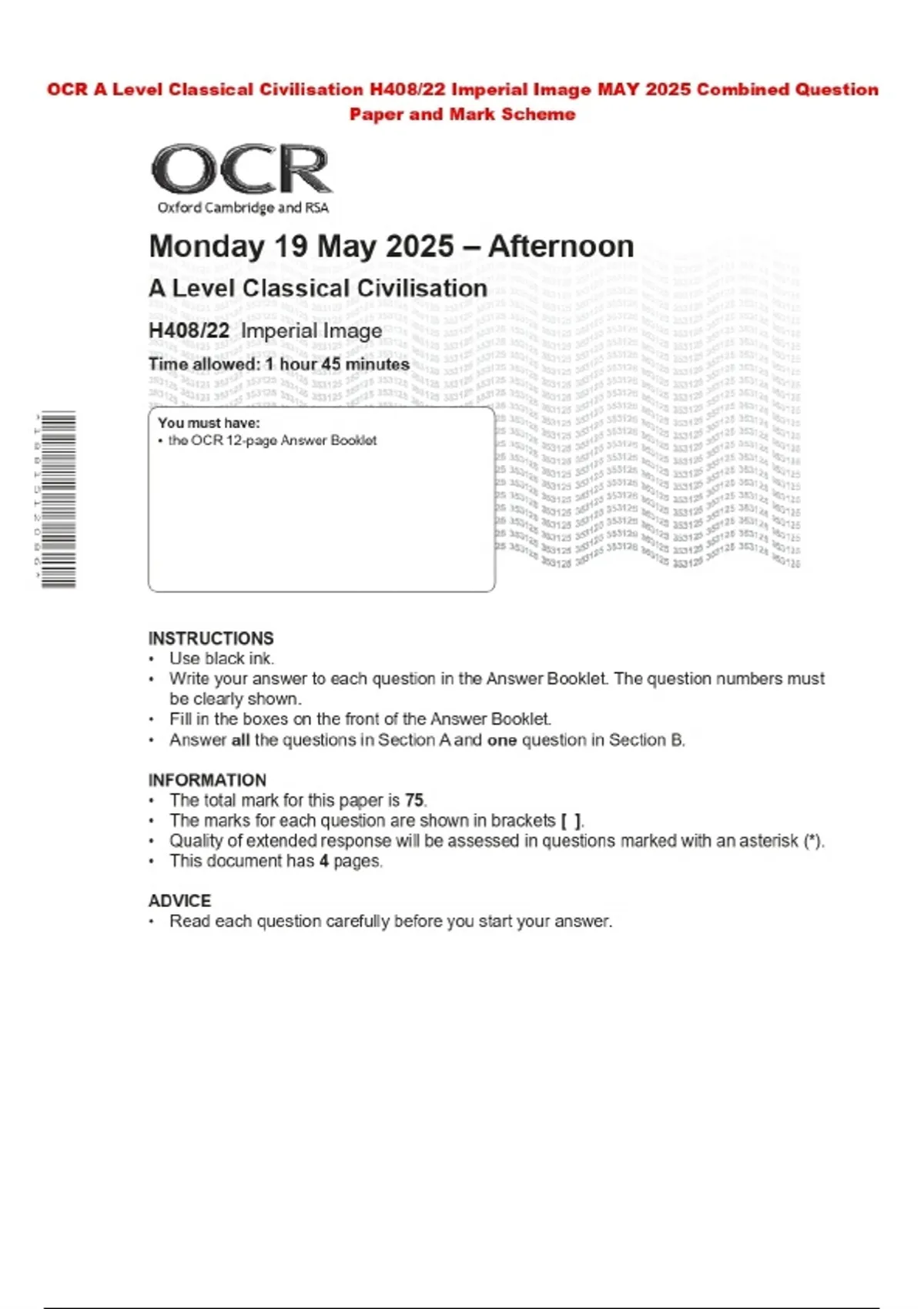 OCR A Level Classical Civilisation H408/22 Imperial Image MAY 2025 Combined Question Paper and Mark Scheme