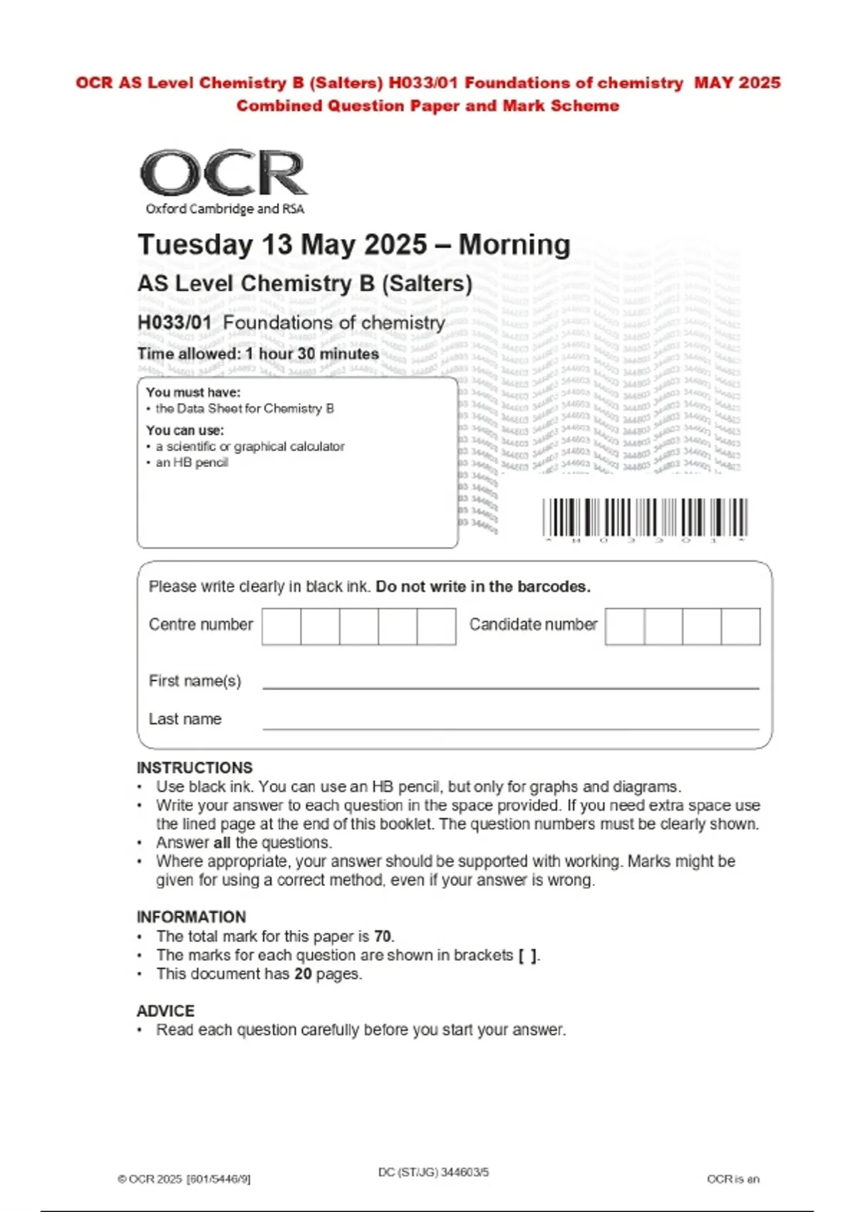 OCR AS Level Chemistry B (Salters) H033/01 Foundations of chemistry MAY 2025 Combined Question Paper and Mark Scheme