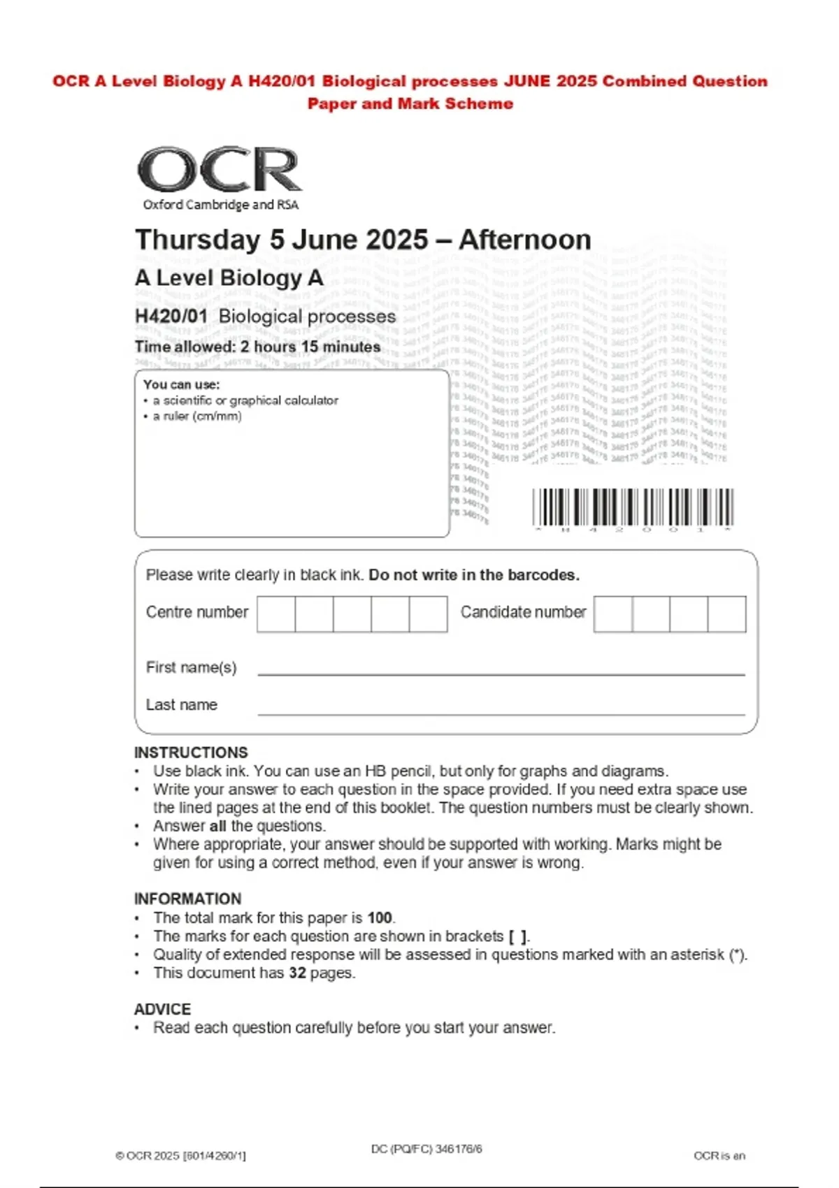 OCR A Level Biology A H420/01 Biological processes JUNE 2025 Combined Question Paper and Mark Scheme