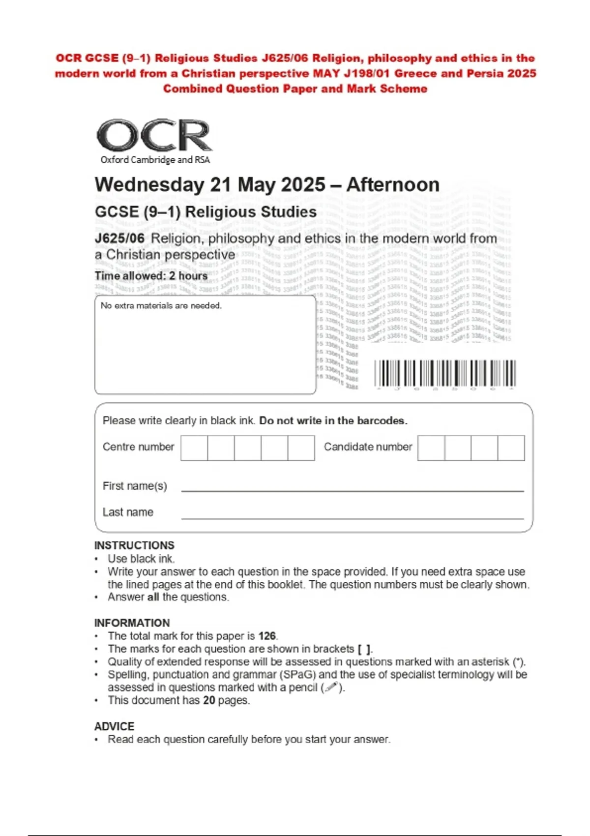OCR GCSE (9–1) Religious Studies J625/06 Religion, philosophy and ethics in the modern world from a Christian perspective MAY J198/01 Greece and Persia 2025 Combined Question Paper and Mark Scheme