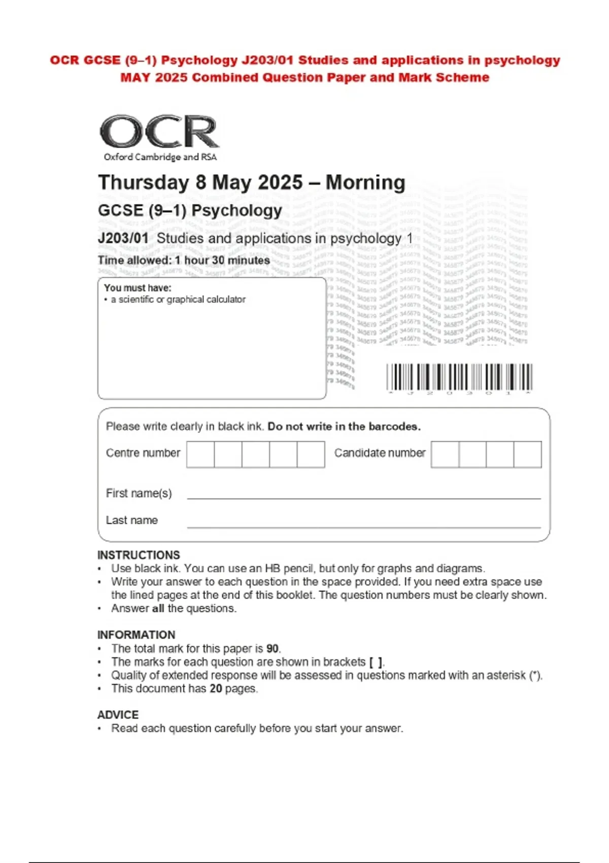 OCR GCSE (9–1) Psychology J203/01 Studies and applications in psychology MAY 2025 Combined Question Paper and Mark Scheme