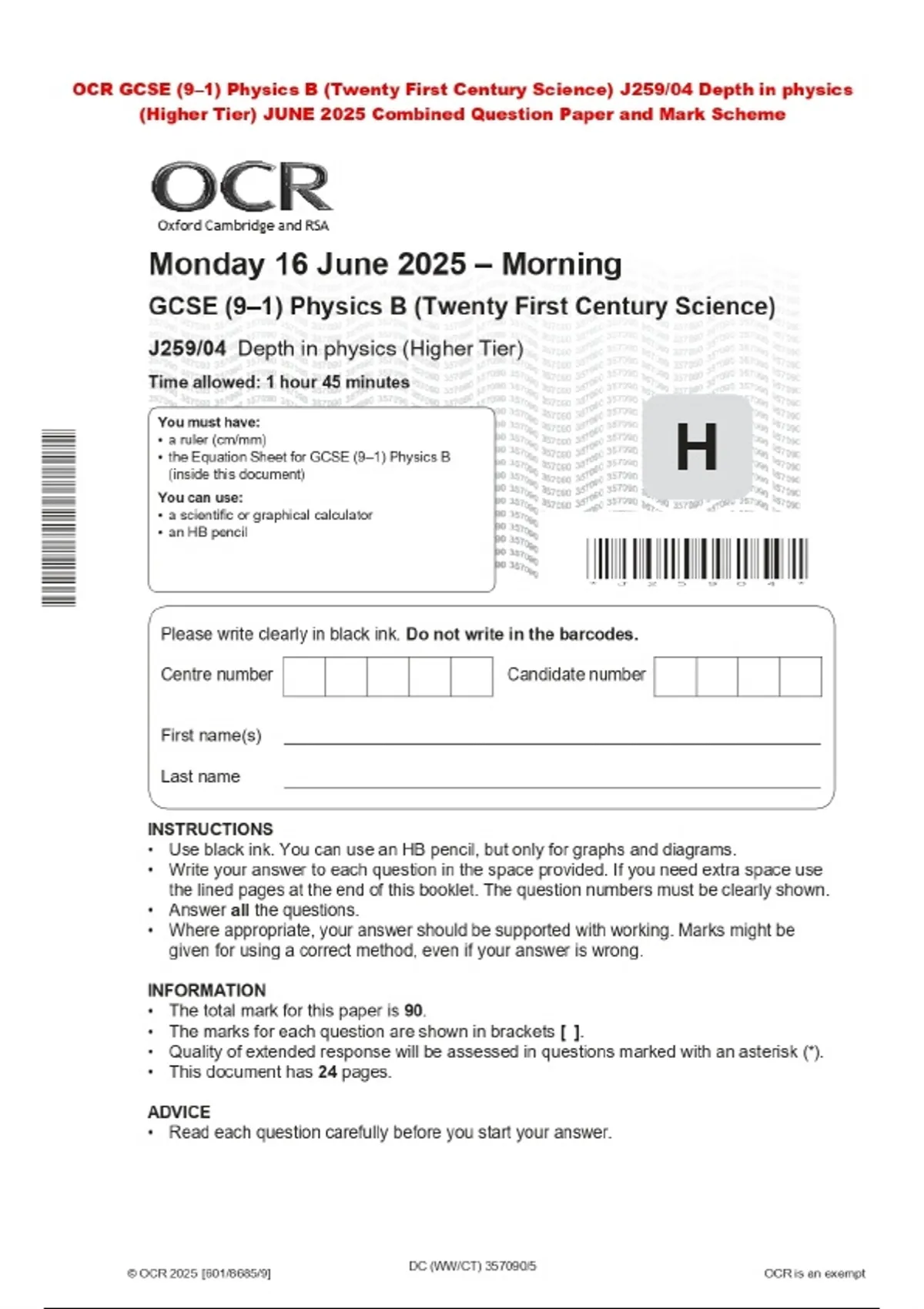OCR GCSE (9–1) Physics B (Twenty First Century Science) J259/04 Depth in physics (Higher Tier) JUNE 2025 Combined Question Paper and Mark Scheme
